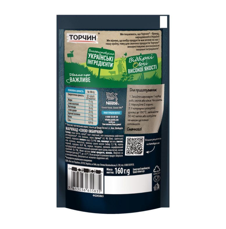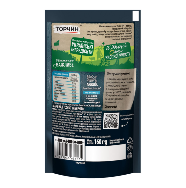 | Склад (укр.) | Вода питна, цукор, оцет спиртовий, олія соняшникова рафінована дезодорована, сіль кухонна, зерно гірчиці (4.5%) (білої, сарептської, чорної), порошок соєвого соусу (3.8%) (соя, пшениця (містить глютен), сіль кухонна, мальтоза), прянощі сушені мелені (імбир (1.5%), перець чорний, куркума (0.01%), кориця, гвоздика), крохмаль модифікований кукурудзяний, карамелізований цукровий сироп (цукор, вода), часник сушений (0.3%) |