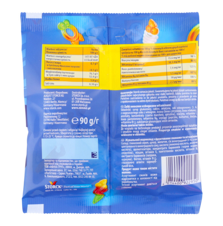 | Склад (укр.) | Глюкозний сироп, цукор, желатин, фруктовий сік (5%) з концентрованого фруктового соку (виноград, бузина), кислота (лимонна кислота, молочна кислота), ароматизатори, концентрати барвникiв (чорна морква, спiруліна), ніацин, вітамін Е, пантотенова кислота, вітамін В6, екстракти барвникiв (куркума, паприка), бiотин, вітамін В12, глазуруючі агенти (карнаубський віск, бджолиний віск, білий і жовтий) |