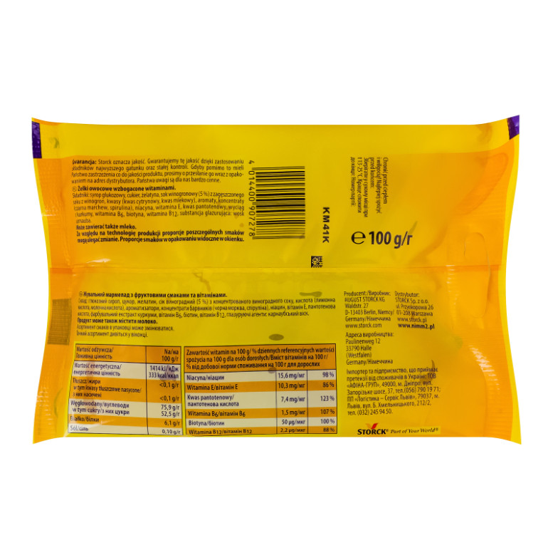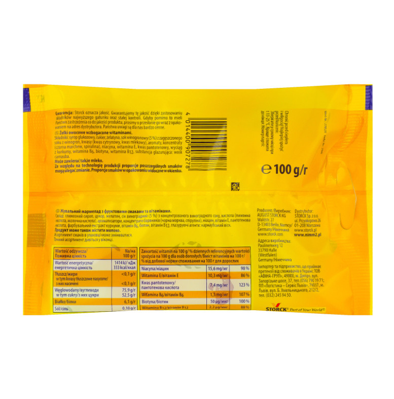 | Склад (укр.) | Глюкозний сироп, цукор, желатин, сік виноградний (5%) з концентрованого виноградного соку, кислота (лимонна кислота, молочна кислота), ароматизатори, концентрати барвників (чорна морква, спіруліна), ніацин, вітамін Е, пантотенова кислота, фарбувальний екстракт куркуми, вітамін В6, біотин, вітамін В12, глазуруючі агенти: карнаубський віск |