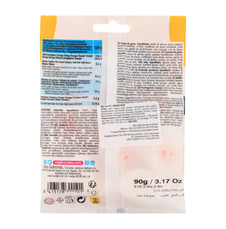 | Склад (укр.) | Сироп глюкози, цукор, желатин, зволожуючий засіб: сорбіти, модифікований картопляний крохмаль, кислоти: молочна кислота, ароматизатори, рослині олії (пальмова, пальмової кісточки), глазур: бджолиний віск, віск карнауба, барвники: Е120, Е160а, Е160с |