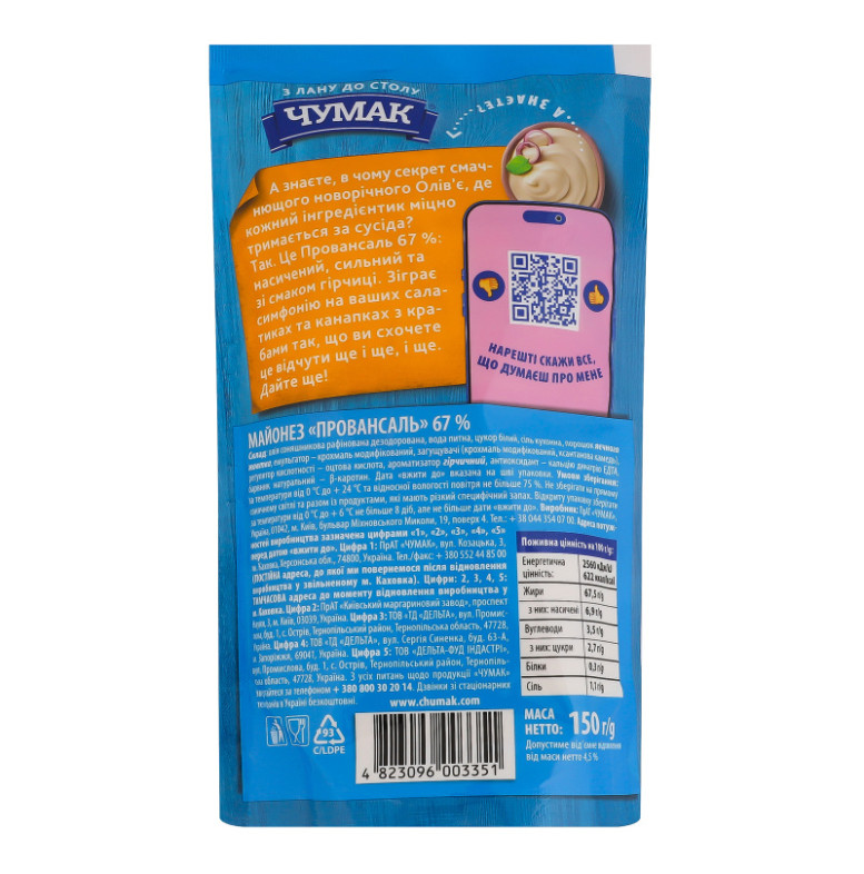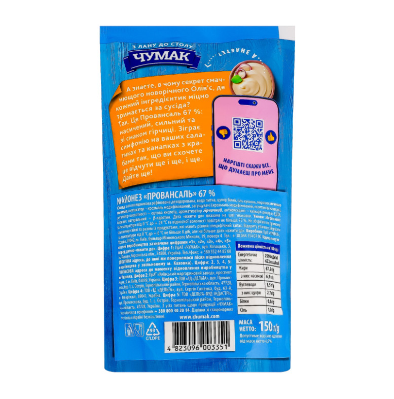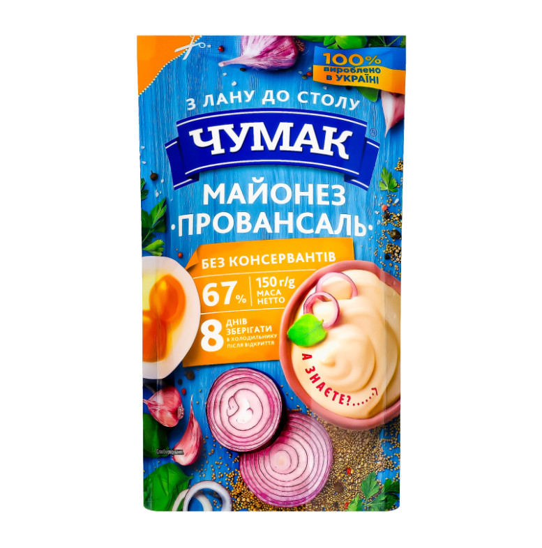 Склад: Олія соняшникова рафінована дезодорована, вода питна, цукор білий, сіль кухонна, порошок яєчного жовтка, емульгатор - крохмаль модифікований, загущувачі (крохмаль модифікований, ксантанова камедь), регулятор кислотності - оцтова кислота, ароматизатор гірчичний, антиоксидант - кальцію динатрію ЕДТА, барвник натуральний - β-каротин