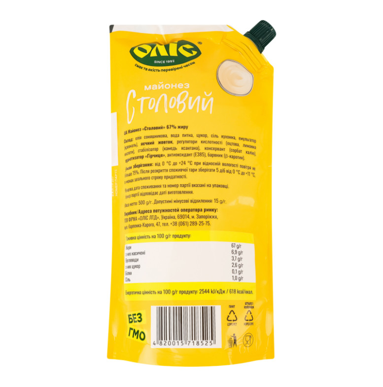 | Склад (укр.) | Олія соняшникова, вода питна, цукор, сіль кухонна, емульгатор (крохмаль), яєчний жовток, регулятори кислотності (оцтова, лимонна кислоти), стабілізатор (камедь ксантана), консервант (сорбат калію), ароматизатор "Гірчиця", антиоксидант (Е385), барвник (β-каротин) |
