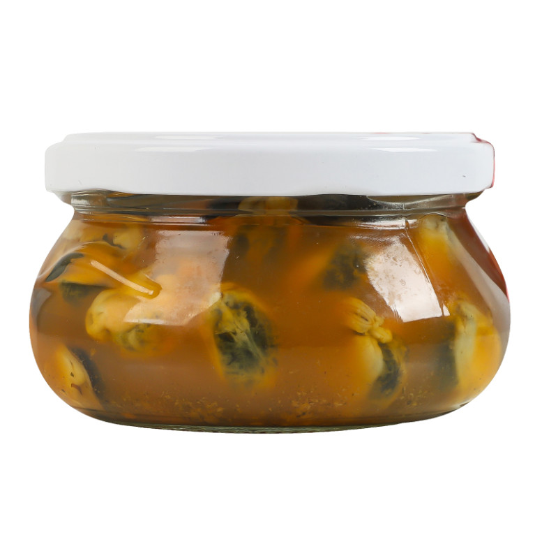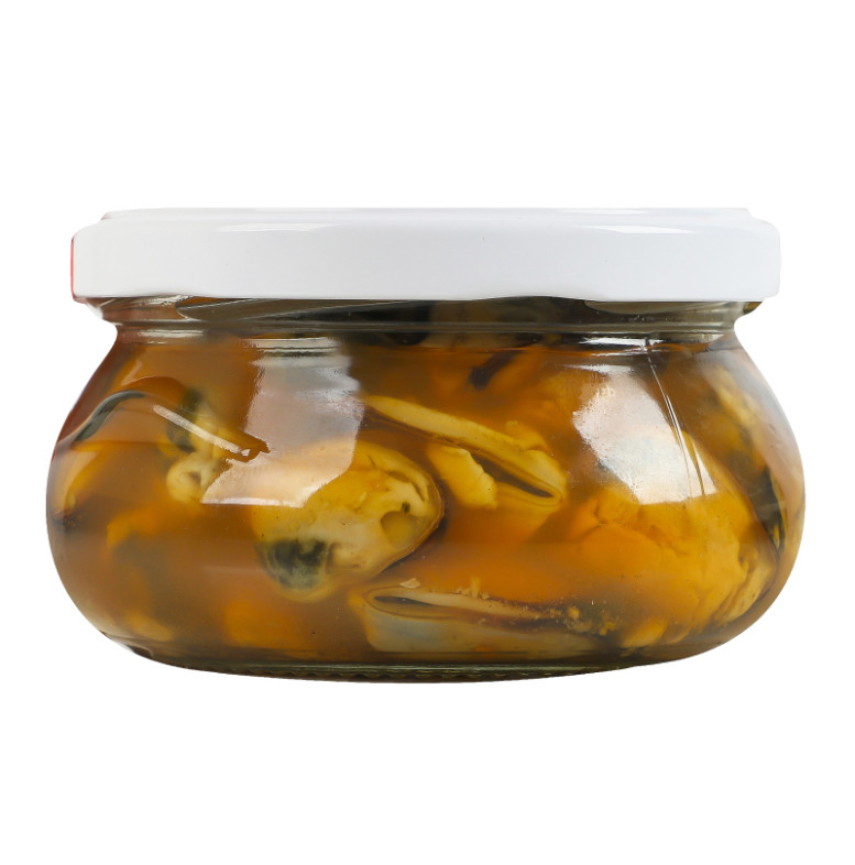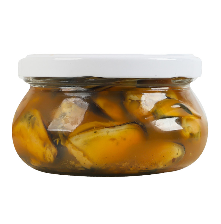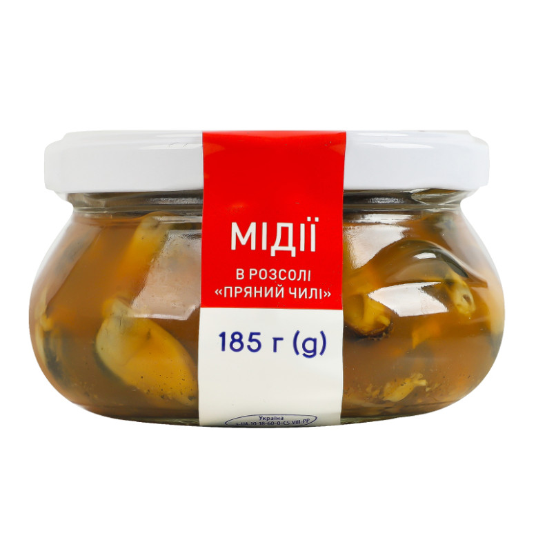 Склад: М'ясо мідій, вода питна, цукор білий, сіль кухонна, кислота оцтова, смаковий препарат "Солодкий Чилі" (декстроза, сіль кухонна, підсилювачі смаку (Е621, Е627, Е631), антиоксидант Е301, суміш екстрактів у змінній пропорції (цибуля, паприка, перець сичуанський, лимонна трава, перець чорний, перець стручковий), ароматизатори (м'ясо, паприка), антиспікаючий агент діоксид кремнію E551), консерванти (Е200, Е211)
