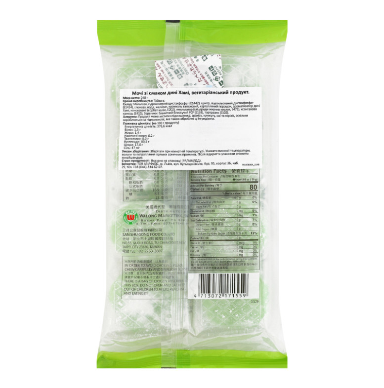 Склад: Мальтоза, гідроксипропілдикрохмальфосфат (Е1442), цукор, ацетильований дикрохмальфосфат (Е1414), глюкоза, вода, желатин, крохмаль тапіоковий, картопляний порошок, ароматизатор дині Хамі, консервант (сорбат калію, Е202), емульгатор (гліцериди жирних кислот, Е471), ксантанова камедь (Е415), барвники: блакитний блискучий FCF (Е133), тартразин (Е102)