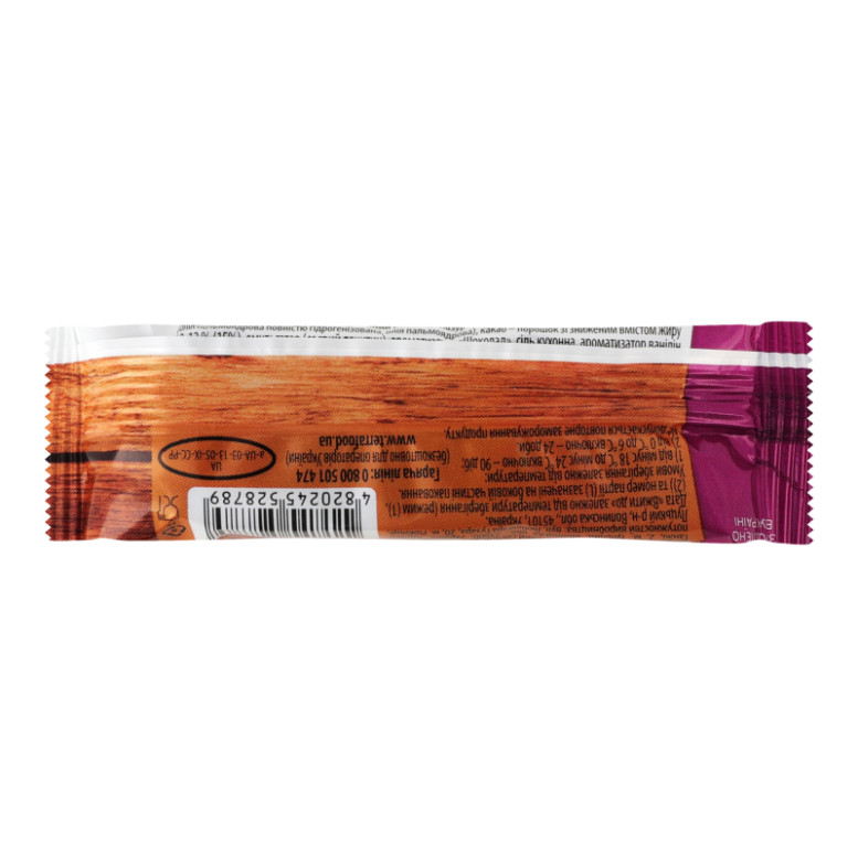 Склад: Сир кисломолочний (43.2%), глазур кондитерська (21.4%) (цукор, рослинний жир (олія пальмоядрова повністю гідрогенізована, олія пальмоядрова), какао-порошок зі зниженим вмістом жиру 10-12% (15%), емульгатор (соєвий лецитин), ароматизатор "Шоколад", сіль кухонна, ароматизатор ванілін, цукор, масло вершкове, стабілізатор ацетильований дикрохмаль фосфат, кранч: пластівці лохини (1%) (лохина (43%), крохмаль, емульгатор соняшниковий лецитин), кранч: пластівці малини (1%) (малина (30%), сахароза, крохмаль), ароматизатори