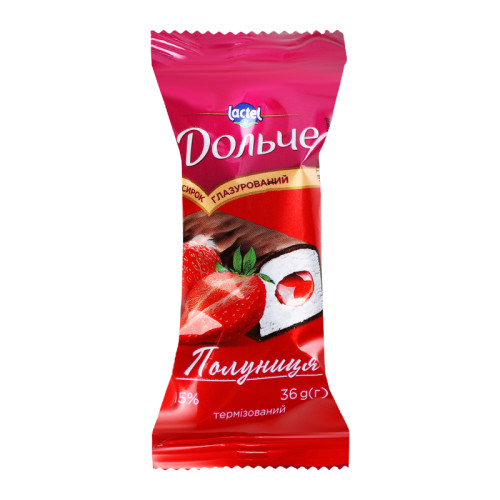 Склад: Сир кисломолочний (43.6%): глазур кондитерська (27.8%) (цукор, жири рослинні (олії пальмоядрова повністю гідрогенізована, кокосова повністю гідрогенізована), какао-порошок зі зниженим вмістом жиру 10-12%, какао терте, емульгатор (соєвий лецитин), сіль кухонна, ароматизатори: "Шоколад", "Ванілін"), наповнювач фруктовий пастеризований "Полуниця" (10%) (полуниця (40%), вода питна, цукор, стабілізатор модифікований крохмаль кукурудзяний, цукровий сироп, ароматизатор полуниці, згущувачі пектини, стабілізатор камедь ріжкового дерева, регулятор кислотності лимонна кислота, натуральні барвники карміни, стабілізатор ксантанова камедь, регулятор кислотності цитрат кальцію), цукор, масло вершкове, стабілізатор модифікований крохмаль кукурудзяний, ароматизатор ванілін
