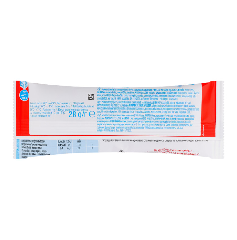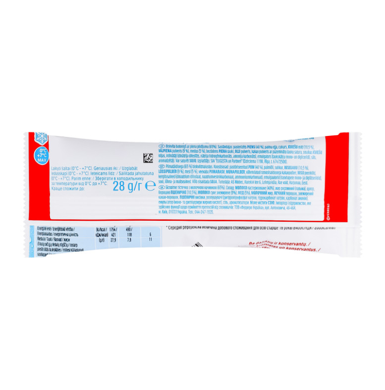| Склад (укр.) | Молоко пастеризоване (40%), жир рослинний (пальма), цукор, борошно пшеничне (10.5%), молоко сухе знежирене (9%), мед (5%), молочний жир, яєчний порошок, знежирений какао-порошок, пшеничні висівки, розпушувачі (дигідропірофосфат натрію, гідрокарбонат натрію, карбонат амонію), емульгатор (моно- та дигліцериди жирних кислот), сіль, ароматизатори |