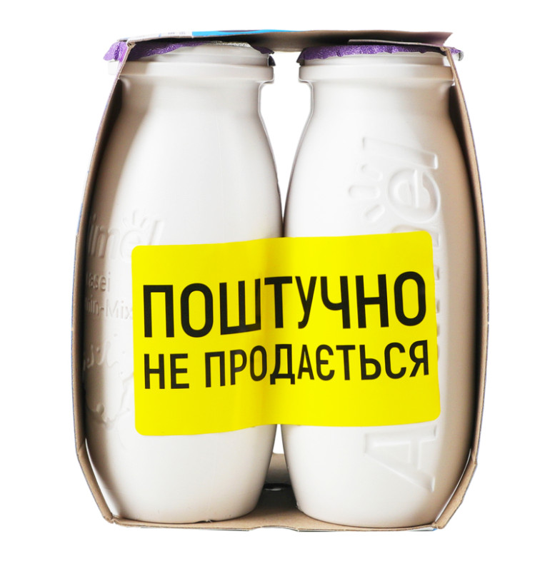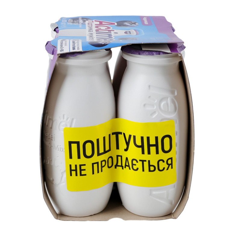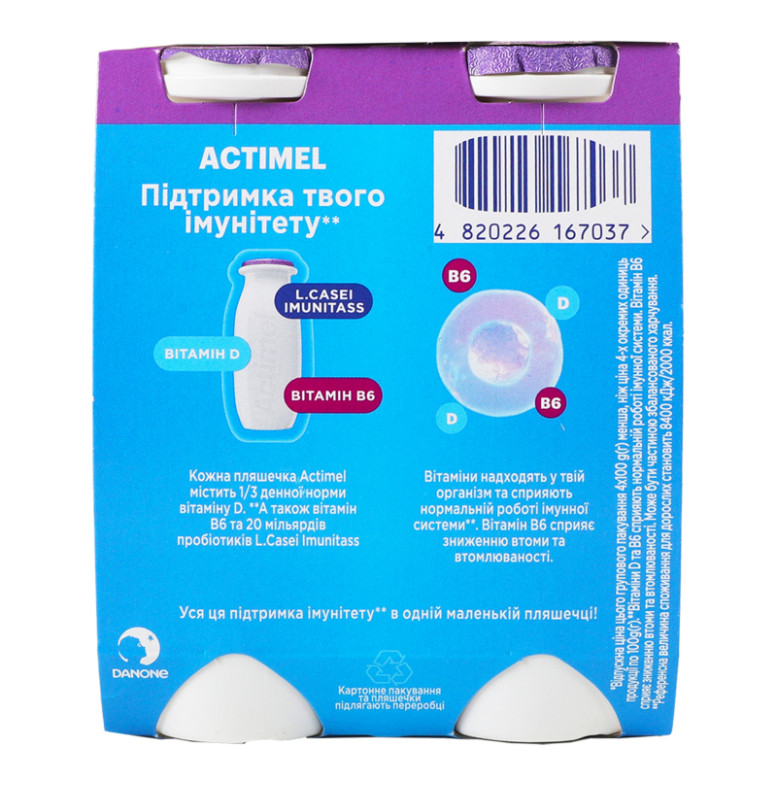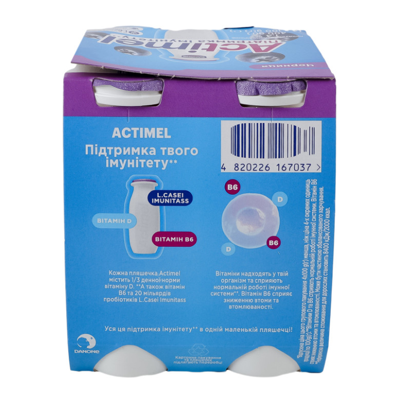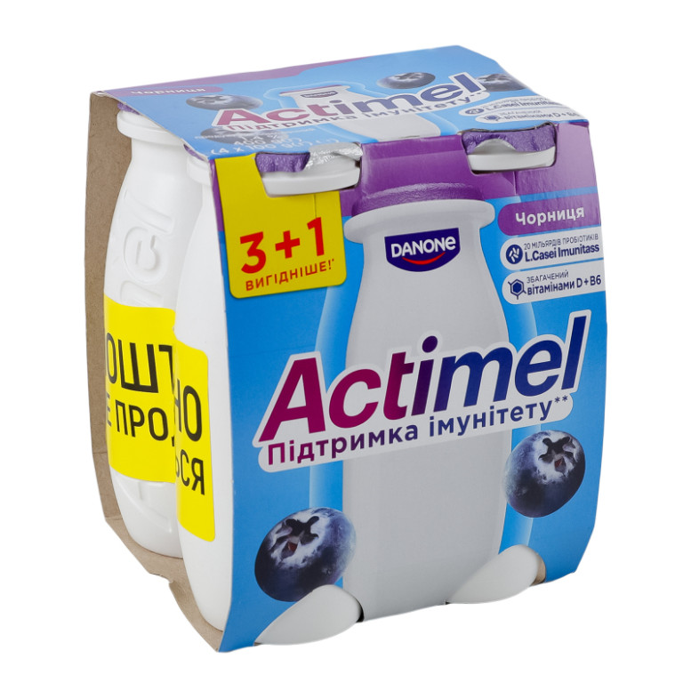 Склад (укр.): Йогурт (молоко знежирене, молоко сухе знежирене, вершки, культури йогуртові), молоко знежирене, сироп цукровий, чорниця (1.2%), ожина, декстроза, крохмаль, концентрат мінеральних речовин молока, ароматизатор натуральний, регулятор кислотності (цитрат натрію), лактобактерії L. casei imunitass, вітамін В6 (4*10^-4%), вітамін D3 (9*10^-4%)