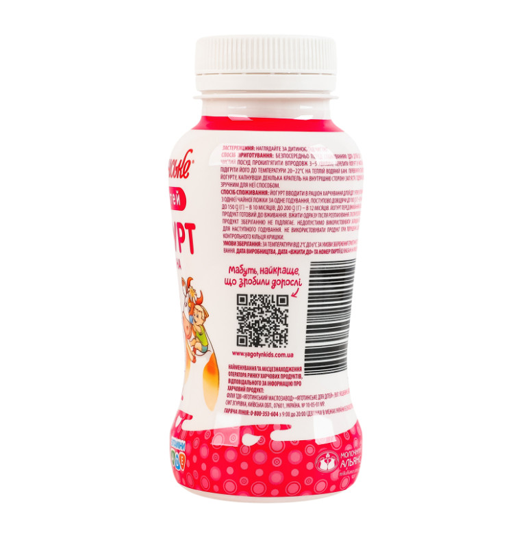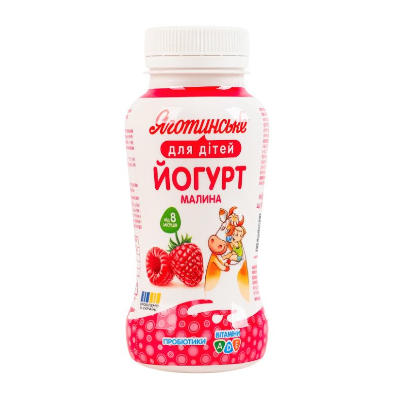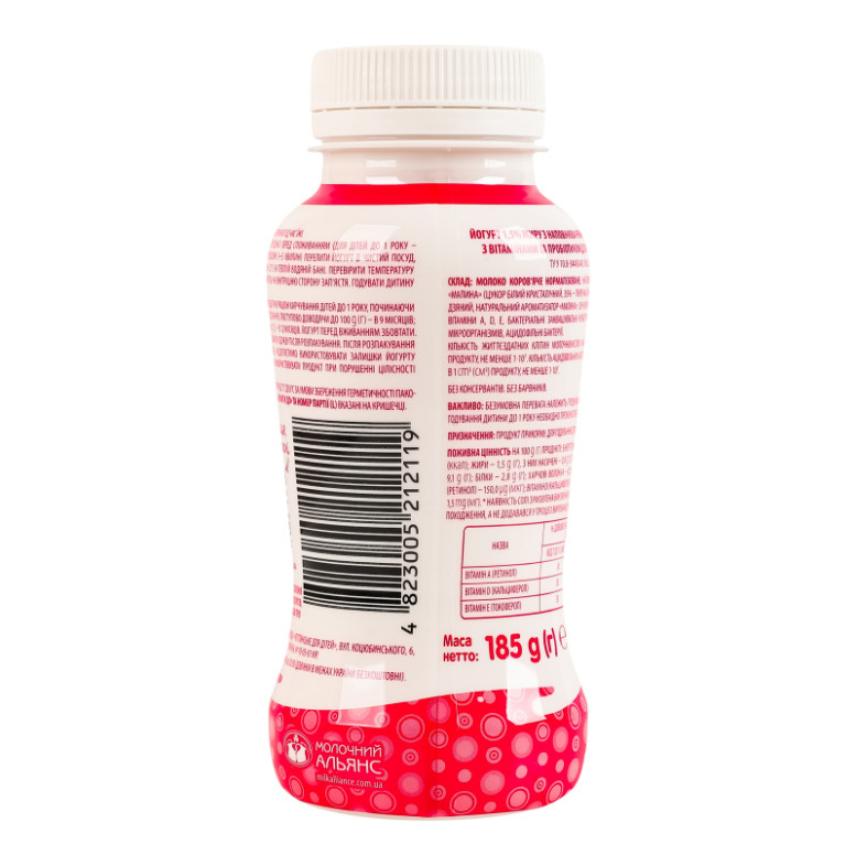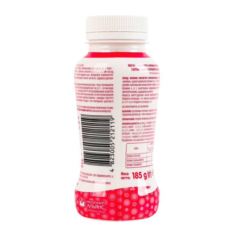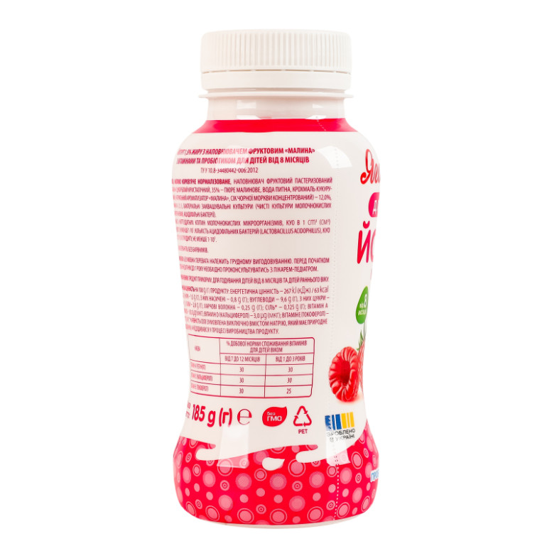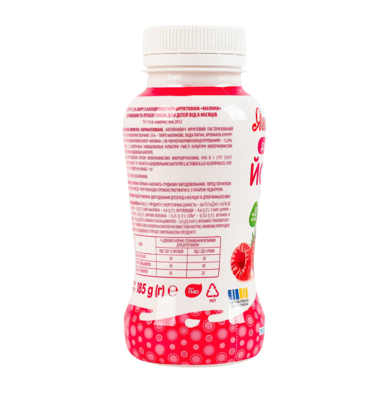 Склад: Молоко коров'яче нормалізоване, наповнювач фруктовий пастеризований “Малина” (цукор білий кристалічний, 35% - пюре малинове, вода питна, крохмаль кукурудзяний, натуральний ароматизатор “Малина”, сік чорної моркви концентрований) - 12%, вітаміни А, D, Е, бактеріальні заквашувальні культури (чисті культури молочнокислих мікроорганізмів, ацидофільні бактерії)