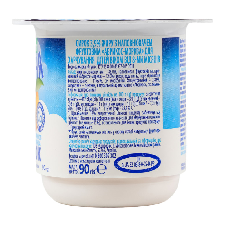 | Склад (укр.) | Сир кисломолочний - 88%, наповнювач фруктовий пастеризований "Абрикос-морква" - 12% (цукор, вода питна, пюре абрикосове концентроване - 11.67%, сік морквяний концентрований - 2.83%, загущувач - пектини, натуральний ароматизатор "Абрикос", сік лимонний концентрований) |