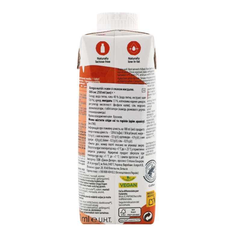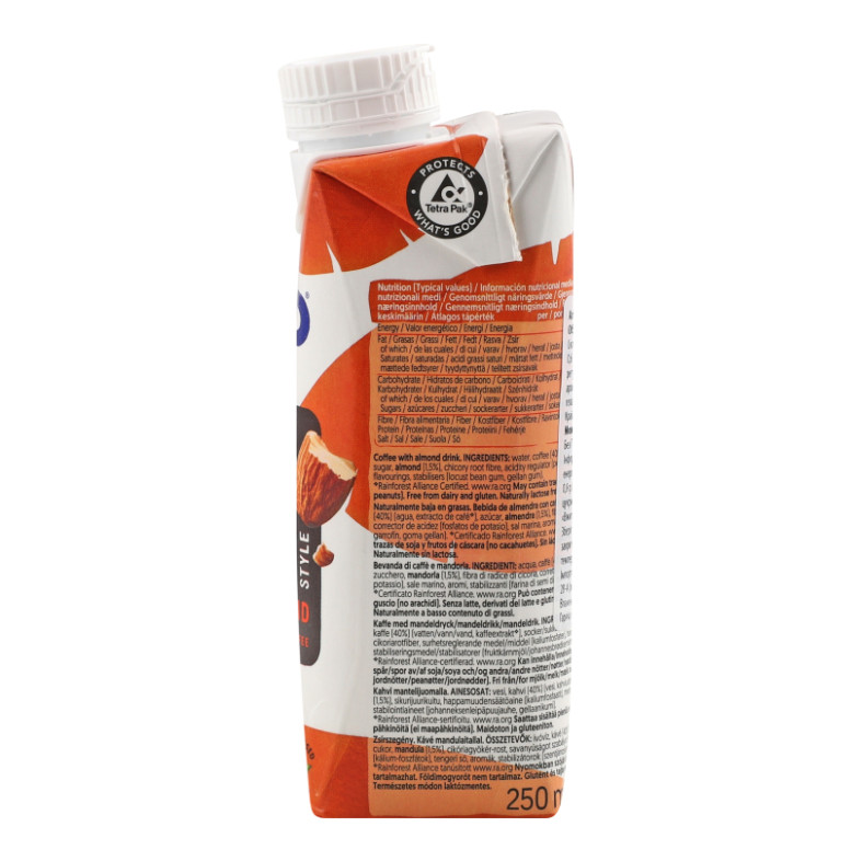 Склад: Вода питна, кава 40% (вода питна, екстракт кави 0.6%), цукор, мигдаль 1.5%, клітковина кореня цикорію, регулятор кислотності (фосфати калію), стабілізатори (камедь ріжкового дерева, геланова камедь)