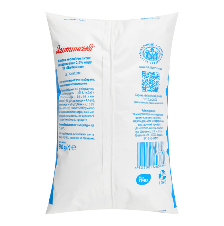 Молоко 2.6% пастеризоване Яготинське м/у 900г