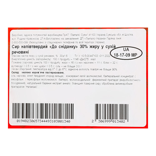 | Склад (укр.) | Молоко коров'яче пастеризоване, сіль харчова, агент твердіння хлорид кальцію, консервант калій азотнокислий, бактеріальний концентрат (мезофільні і термофільні молочнокислі бактерії), молокозсідальний ферментний препарат (мікробіологічного походження), натуральний барвник екстракт аннато |
