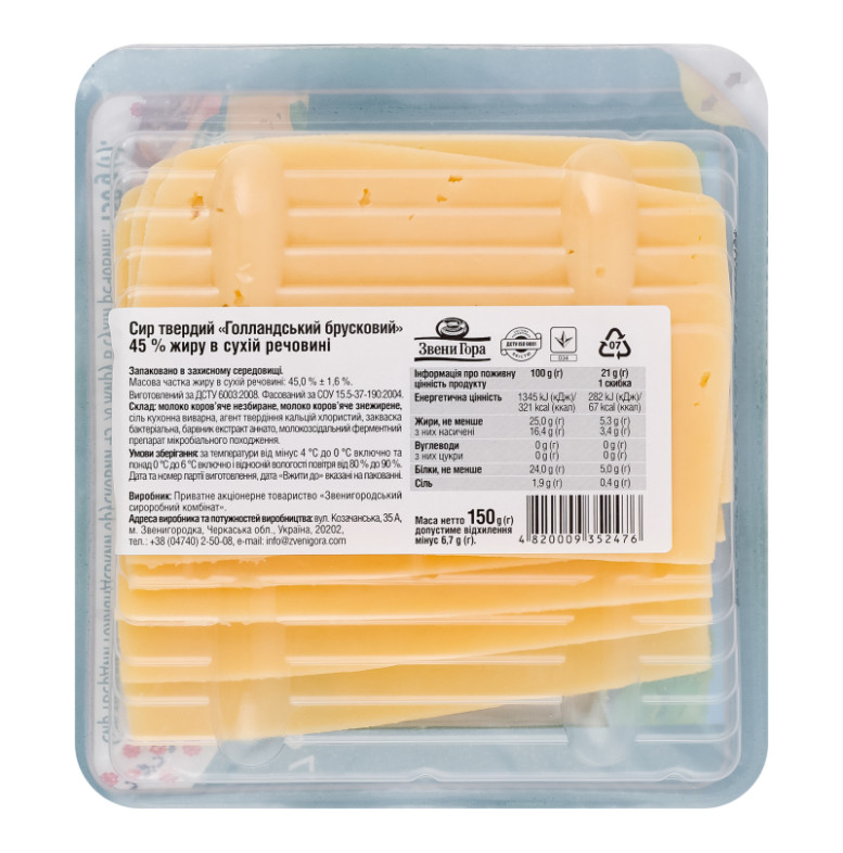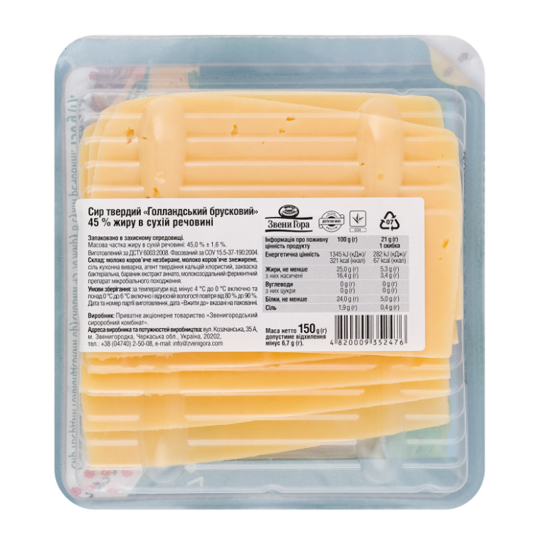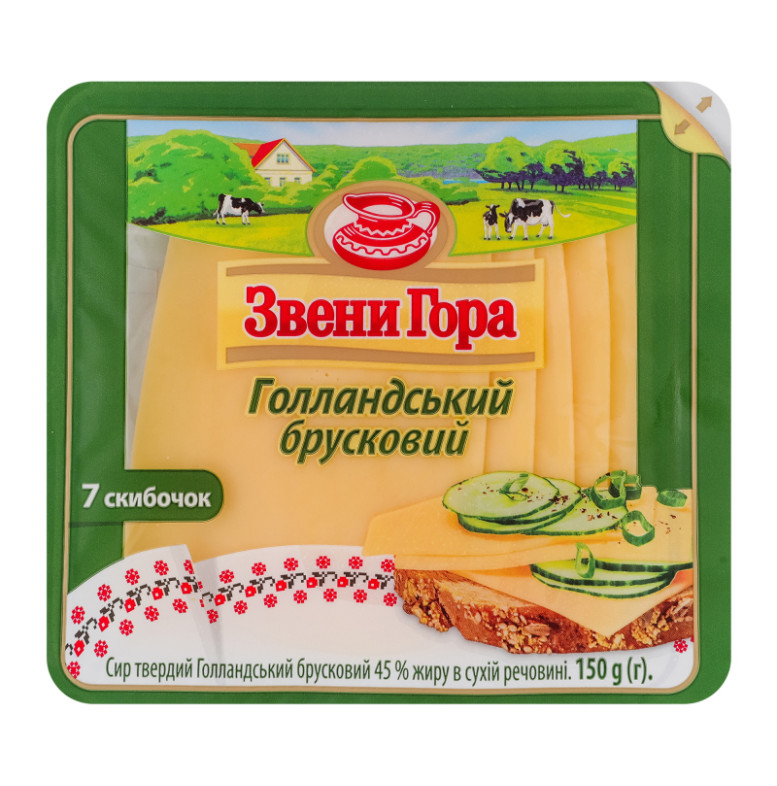 Сир 45% твердий нарізка Голландський брусковий Звени Гора лоток 150г