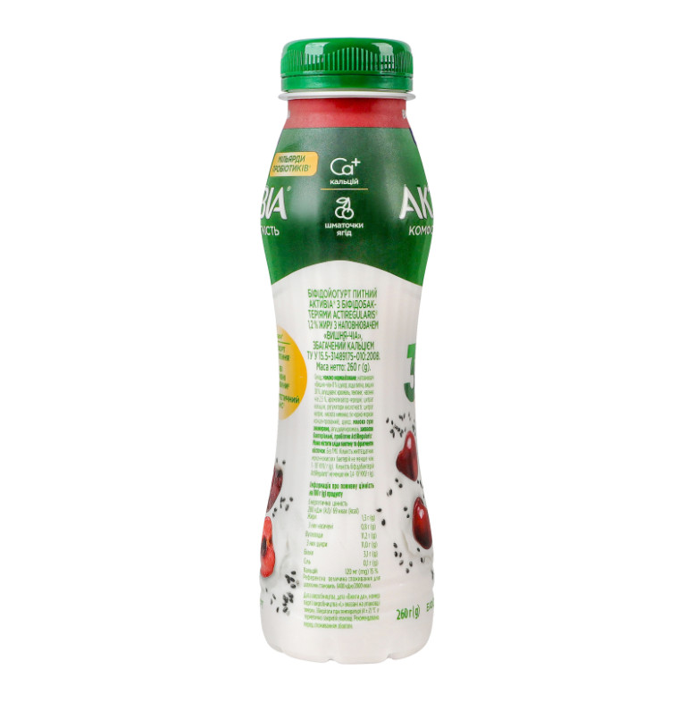 | Склад (укр.) | Молоко нормалізоване, наповнювач "Вишня-чіа" 8% (цукор, вода питна, вишня 30%, загущувачі: крохмаль, пектини, насіння чіа 2.5%, ароматизатор черешні, цитрат кальцію, регулятори кислотності: цитрат натрію, кислота лимонна, сік чорної моркви концентрований), цукор, молоко сухе знежирене, загущувач крохмаль, закваски бактеріальні, пробіотик ActiRegularis |