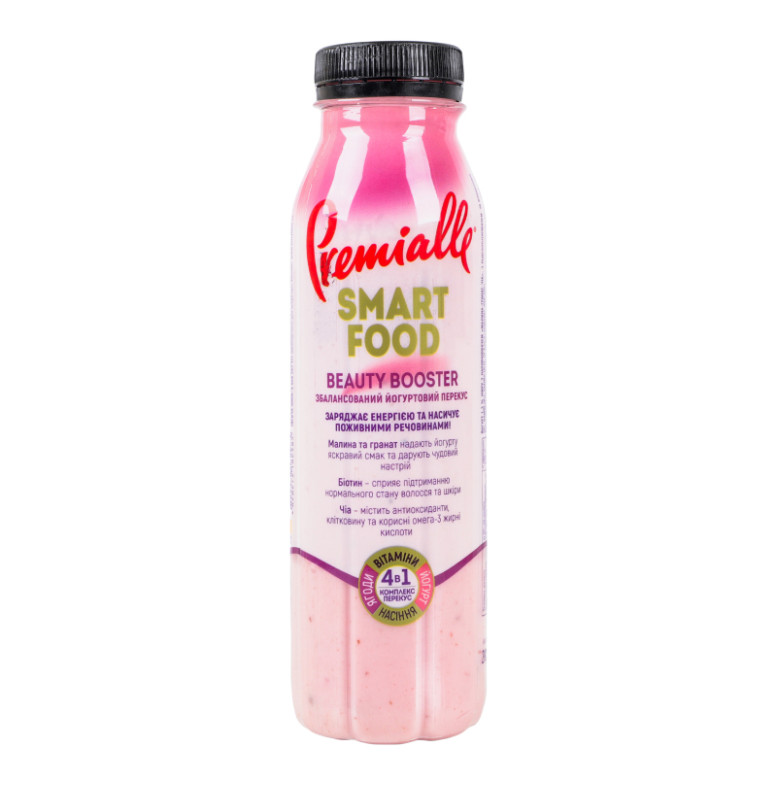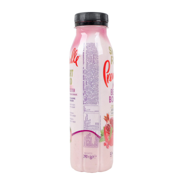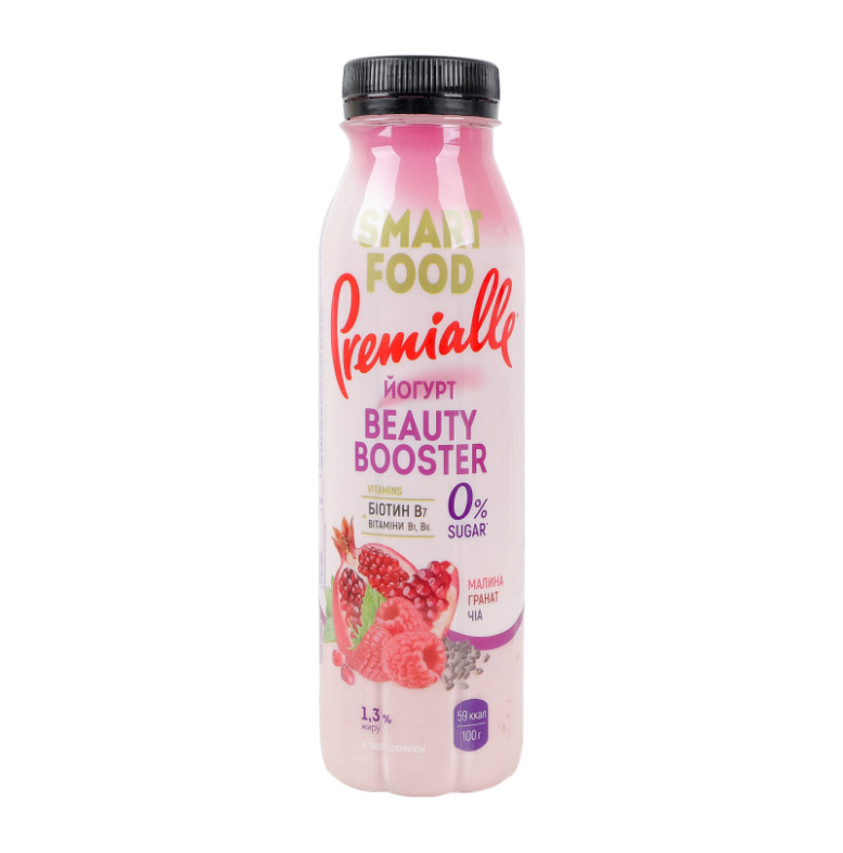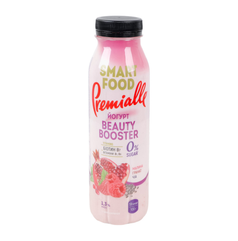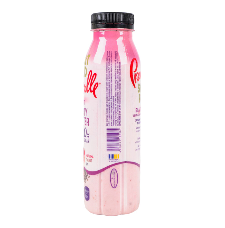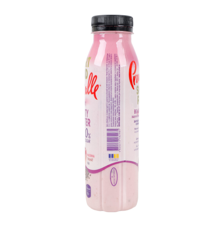 Склад: Молоко коров'яче знежирене, молоко коров'яче незбиране, наповнювач пастеризований "Малина-гранат-чіа" (20%) (вода питна, пюре малинове (22%), сік білого винограду концентрований, сікгранатовий відновлений (8%), стабілізатори та загущувачі: крохмаль кукурудзяний, пектин, зерна чіа (2.5%), клітковина з насіння льону, барвники: концентровані соки чорної моркви та чорної смородини, ароматизатор малини, натуральний ароматизатор, тип "Малина", регулятори кислотності: кальцій молочний, сік лимонний концентрований), стабілізаційна система (ацетильований дикрохмаль адипат, желатин, пектини, гуарова камедь), премікс мікронутрієнтів (0.025%): вітамін В6 (піридоксину гідрохлорид), тіамін (вітамін В1), біотин (вітамін В7), закваска чистих культур молочнокислих бактерій для йогурту, підсолджувач сукралоза (0.005%), регулятор кислотності яблучна кислота