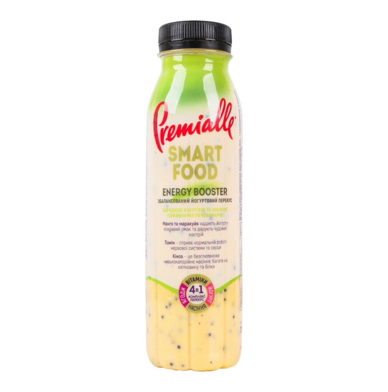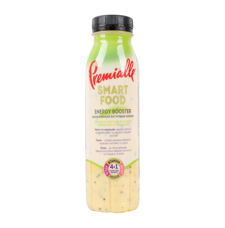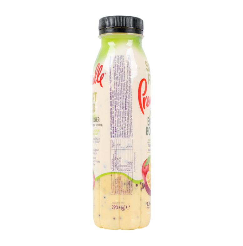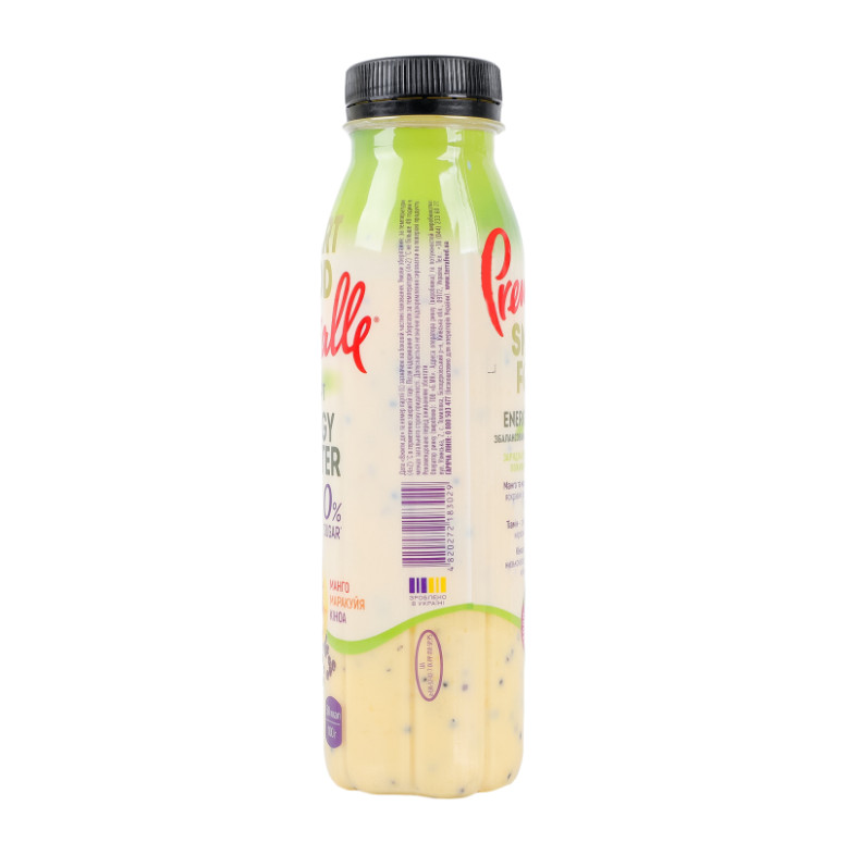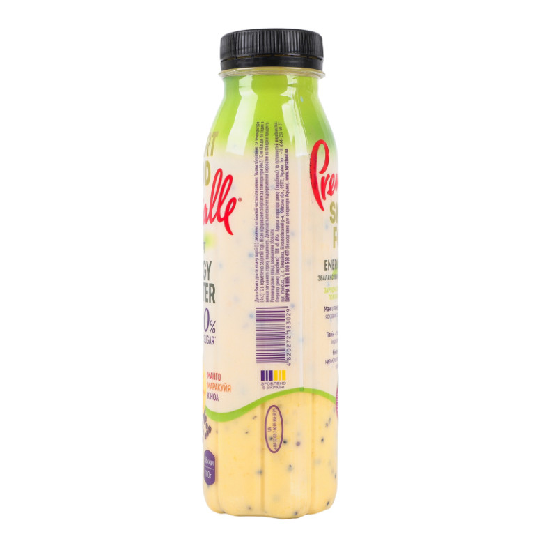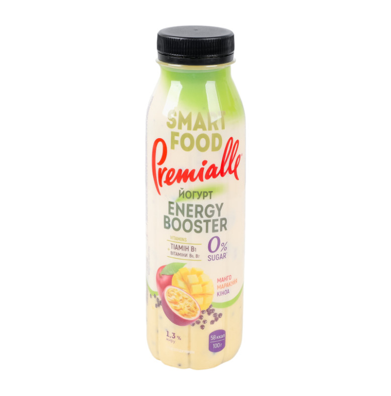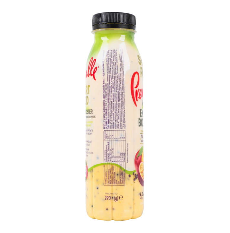 Склад: Молоко коров'яче знежирене, молоко коров'яче незбиране, наповнювач пастеризований "Манго-маракуйя-кіноа" (20%) (вода питна, манго (22%), сік білого винограду концентрований, пюре манго відновлене (10%), кіноа чорна (4%), сік маракуйї відновлений (2.9%), стабілізатори та загущувачі: крохмаль кукурудзяний, пектини, сік лимонний відновлений, натуральний ароматизатор тип "Маракуйя", ароматизатор манго, барвник бета-каротин, регулятор кислотності цитрат натрію), стабілізаційна система (ацетильований дикрохмаль адипат, желатин, пектини, гуарова камедь), премікс мікронутрієнтів (0.025%): вітамін В6 (піридоксину гідрохлорид), тіамін (вітамін В12, біотин (вітамін В7), закваска чистих культур молочнокислих бактерій для йогурту, підсолоджувач сукралоза (0.005%), регулятор кислотності яблучна кислота