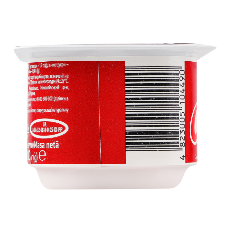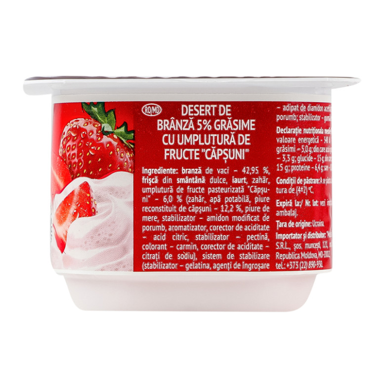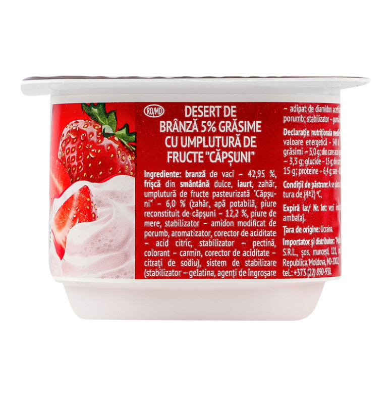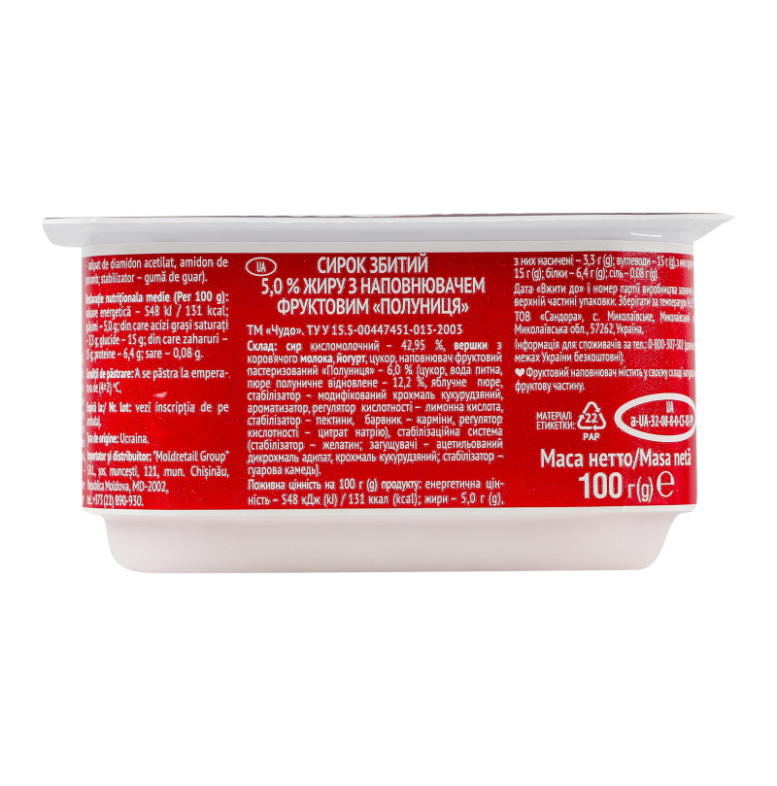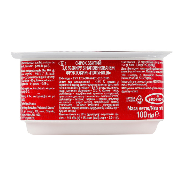 | Склад (укр.) | Сир кисломолочний - 42.95%, вершки з коров'ячого молока, йогурт, цукор, наповнювач фруктовий пастеризований "Полуниця" - 6% (цукор, вода питна, пюре полуничне відновлене - 12.2%, яблучне пюре, стабілізатор - модифікований крохмаль кукурудзяний, ароматизатор, регулятор кислотності - лимонна кислота, стабілізатор - пектини, барвник - карміни, регулятор кислотності - цитрат натрію), стабілізаційна система (стабілізатор - желатин, загущувачі - ацетильований дикрохмаль адипат, крохмаль кукурудзяний, стабілізатор - гуарова камедь) |