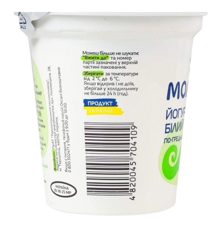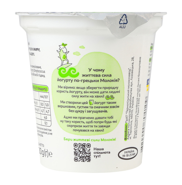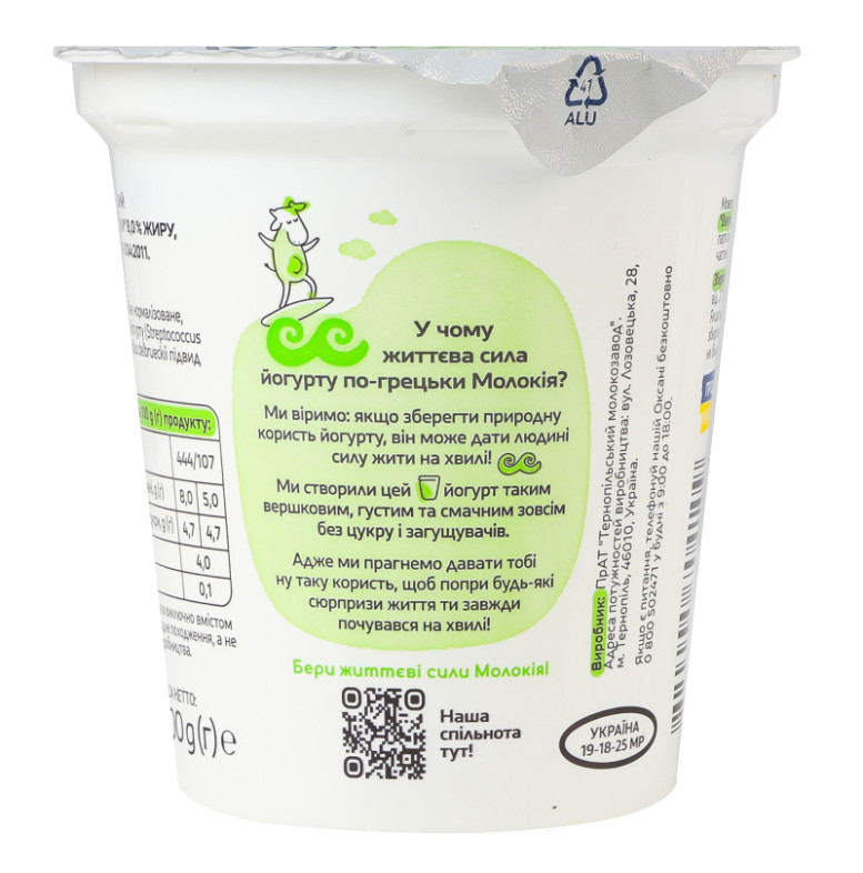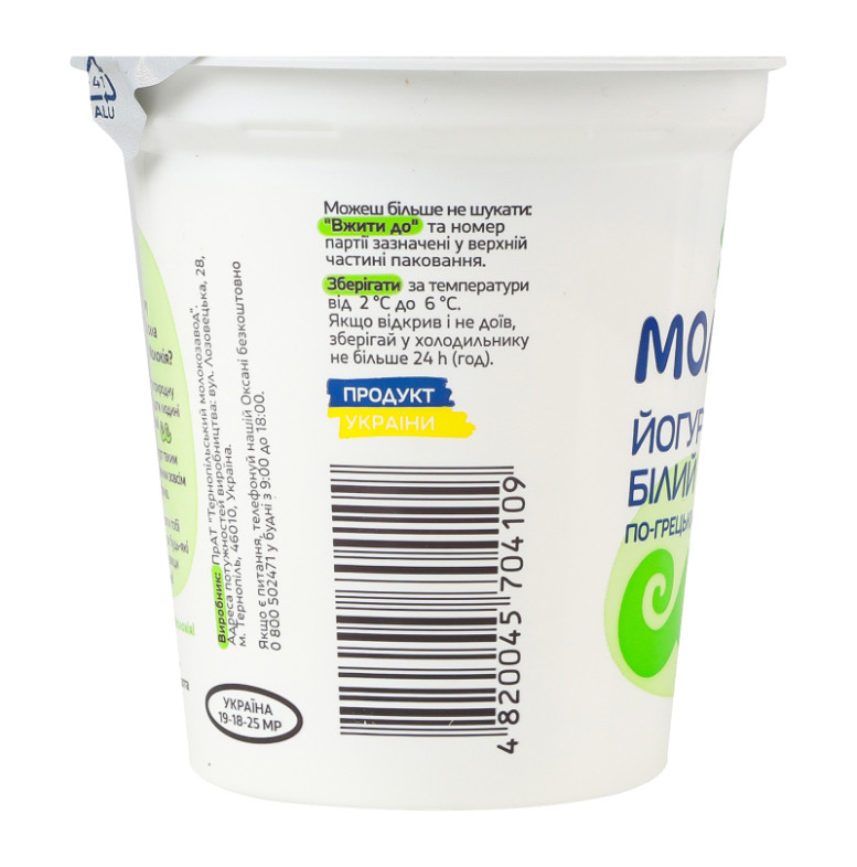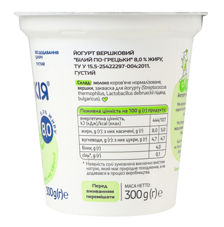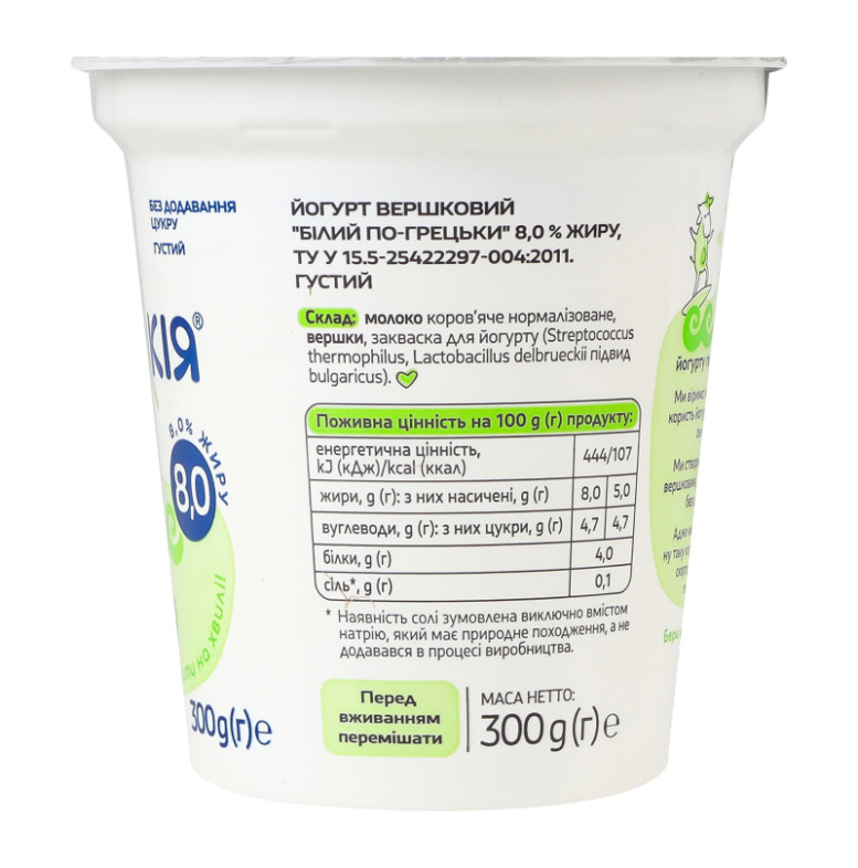 Склад (укр.)Молоко коров'яче нормалізоване, вершки, закваска для йогурту (Streptococcus thermophilus, Lactobacillus delbrueckii підвид bulgaricus)