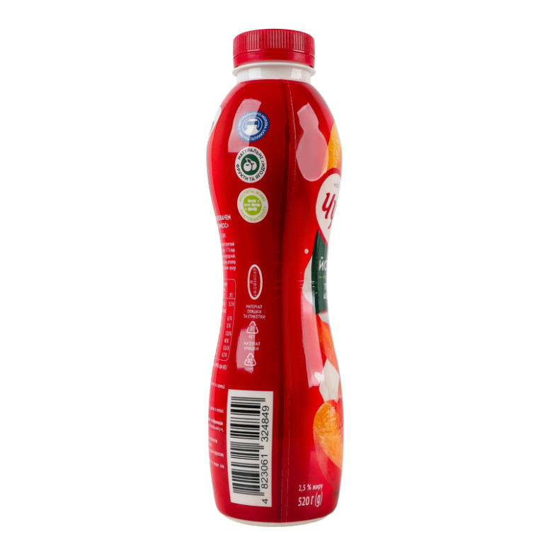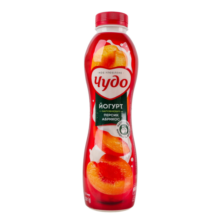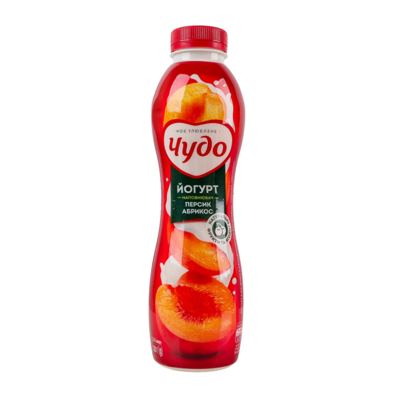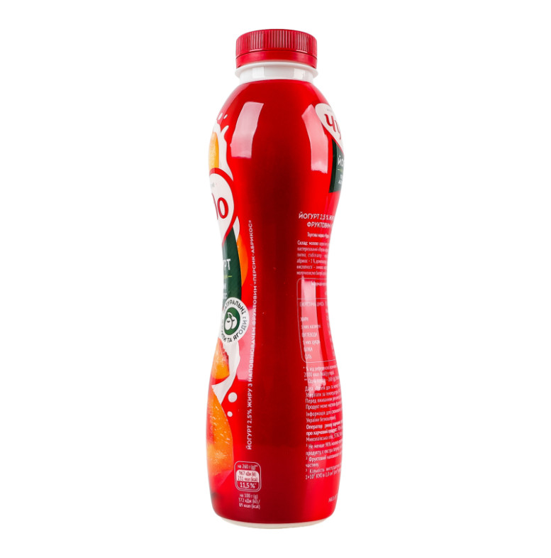 | Склад (укр.) | Молоко коров'яче нормалізоване, наповнювач фруктовий пастеризований "Персик-абрикос" - 10% (цукор, персик - 31%, вода питна, стабілізатор - модифікований крохмаль кукурудзяний, абрикос - 1%, ароматизатори, барвник - аннато норбіксин, регулятор кислотності - лимонна кислота), цукор, закваска чистих культур молочнокислих бактерій для йогурту |