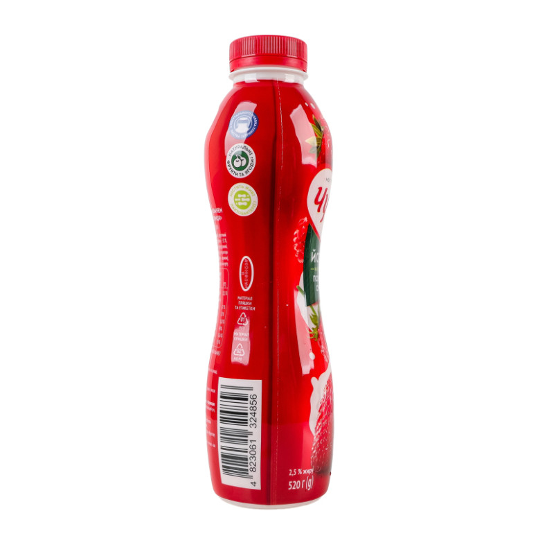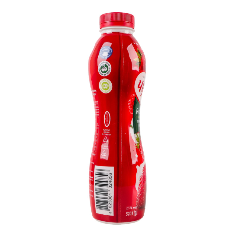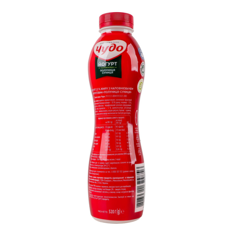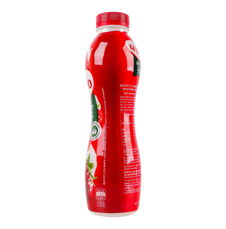 | Склад (укр.) | Молоко коров'яче нормалізоване, наповнювач фруктовий пастеризований "Полуниця-суниця" - 10% (цукор, полуниця - 31%, вода питна, стабілізатор - модифікований крохмаль кукурудзяний, пюре суниці відновлене - 1%, ароматизатори, регулятори кислотності - лимонна кислота, натрію цитрати, барвник - карміни), цукор, закваска чистих культур молочнокислих бактерій для йогурту |