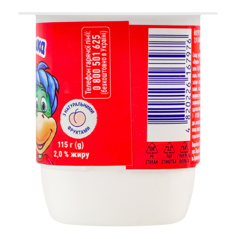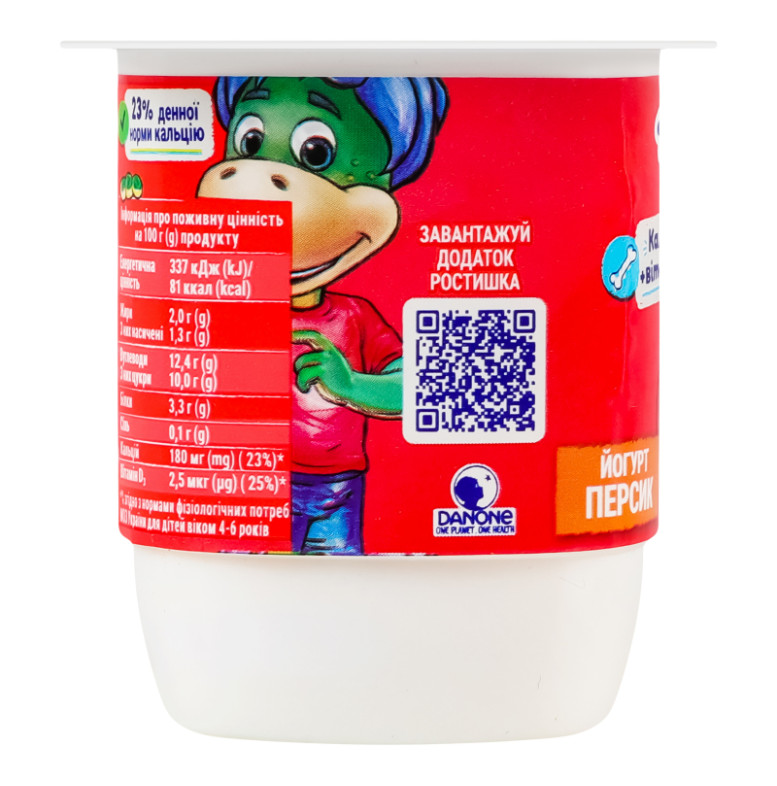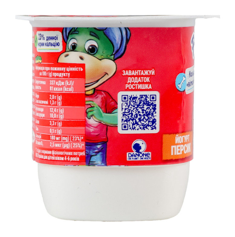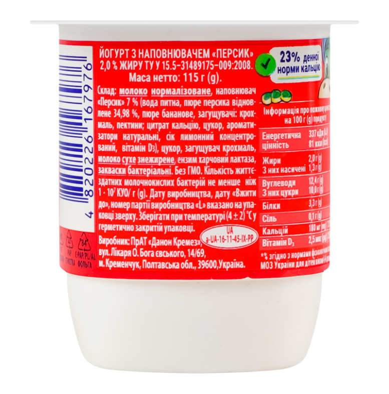 | Склад (укр.) | Молоко нормалізоване, наповнювач "Персик" 7% (вода питна, пюре персика відновлене 34.98%, пюре бананове, загущувачі: крохмаль, пектини; цитрат кальцію, цукор, ароматизатори натуральні, сік лимонний концентрований, вітамін D3), цукор, загущувач крохмаль, молоко сухе знежирене, ензим харчовий лактаза, закваски бактеріальні |