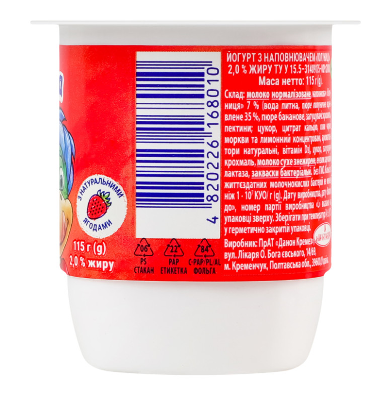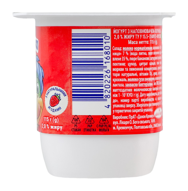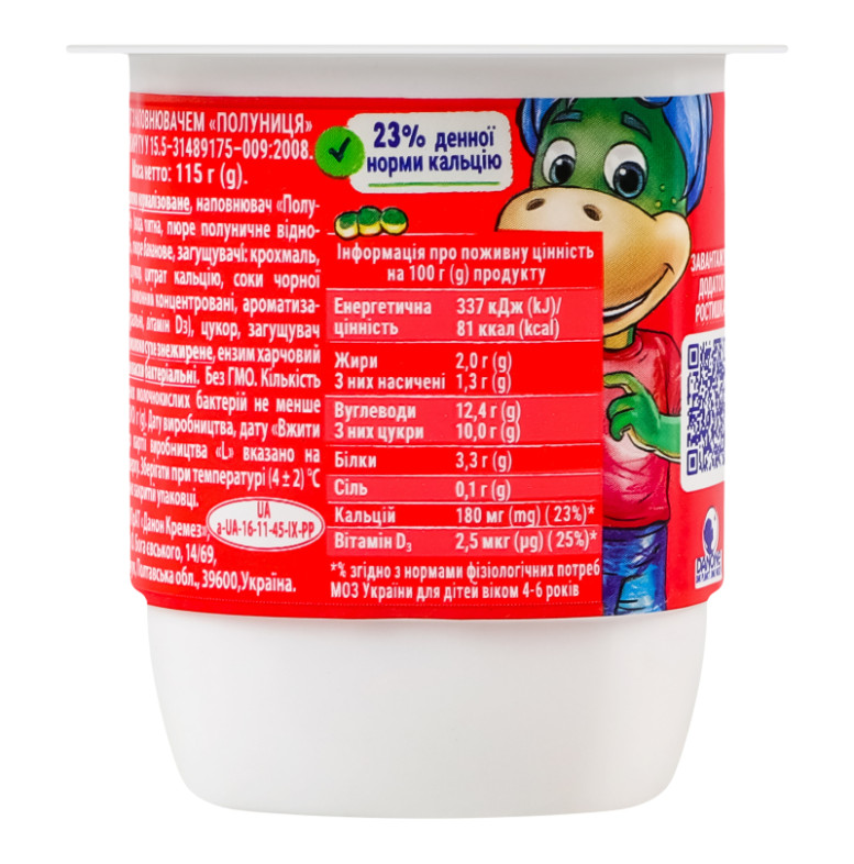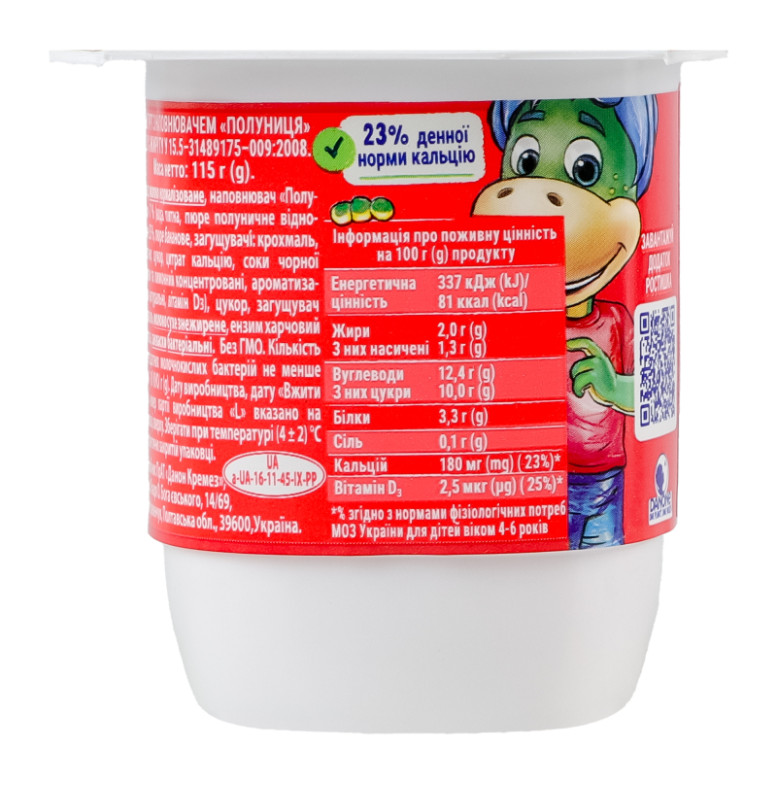 | Склад (укр.) | Молоко нормалізоване, наповнювач "Полуниця" 7% (вода питна, пюре полуничне відновлене 35%, пюре бананове, загущувачі: крохмаль, пектини; цукор, цитрат кальцію, соки чорної моркви та лимонний концентровані, ароматизатори натуральні, вітамін D3), цукор, загущувач крохмаль, молоко сухе знежирене, ензим харчовий лактаза, закваски бактеріальні |