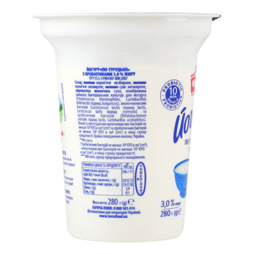 | Склад (укр.) | Молоко коров'яче незбиране, молоко коров'яче знежирене, молоко сухе знежирене, сироватка молочна суха, комбінована закваска: бактеріальних культур для йогурту (Streptococcus thermophiles, Lactobacillus delbrueckii підвид bulgaricus), молочнокислих бактерій (Lactococcus lactis підвид lactis, Lactococcus lactis підвид cremoris) пробіотичних бактерій (Bifidobacterium animalis підвид lactis, Lactobacillus acidophilus) |
