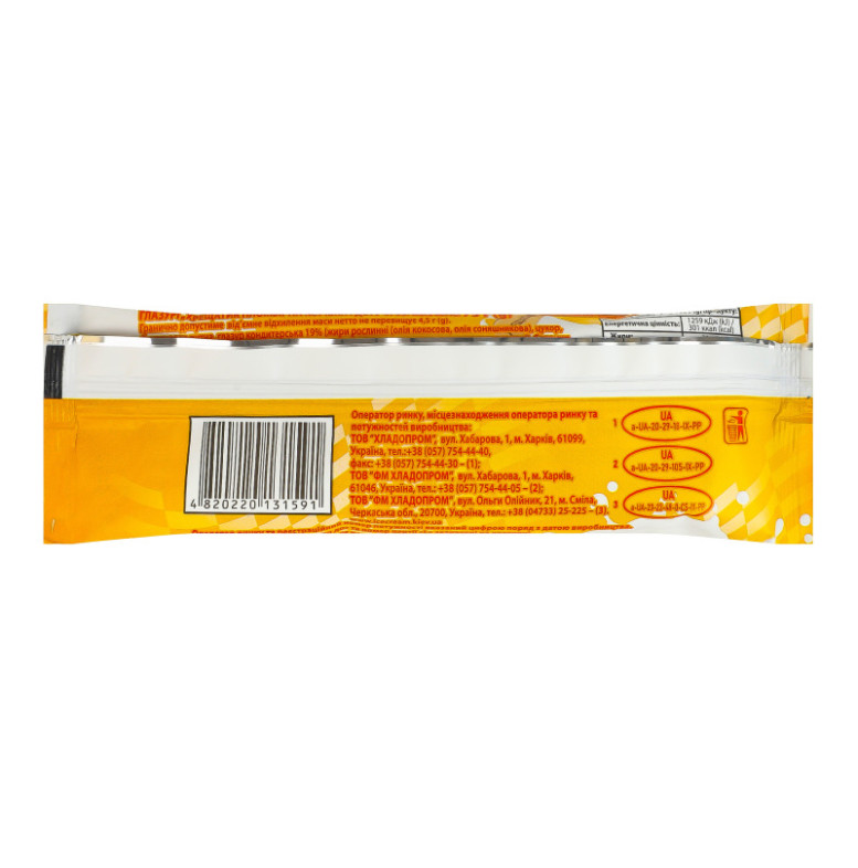 Склад: Вода питна, глазур кондитерська 19% (жири рослинні (олія кокосова, олія соняшникова), цукор, сироватка молочна суха, молоко сухе знежирене, какао-порошок, емульгатор лецитин соєвий, барвник харчовий натуральний екстракт паприки, ароматизатори, сіль кухонна), масло вершкове 10%, цукор, наповнювач "Варене згущене молоко" 9% (молоко незбиране згущене з цукром 45%, цукор, патока крохмальна, декстроза, загущувач крохмаль кукурудзяний модифікований, желюючий агент каррагінан, барвник харчовий натуральний цукровий колер II, ароматизатор), молоко сухе знежирене, суміш стабілізаторів та емульгаторів (моно- та дигліцериди жирних кислот, камедь ріжкового дерева, гуарова камедь, каррагінан), барвники харчові натуральні (цукровий колер IV, екстракти каротинів), ароматизатор, "Карамель", сіль кухонна