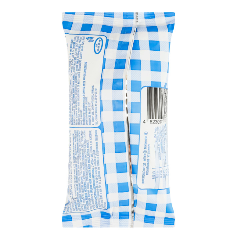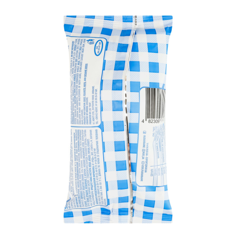 Склад: Молоко знежирене, масло солодковершкове, цукор, вода питна, вафельний стаканчик 6.2% (борошно пшеничне, вода питна, олія кокосова, клітковина рослинна (з пшениці), емульгатор лецитин соєвий, сіль кухонна, розпушувач тіста бікарбонат натрію), молоко згущене незбиране з цукром, молоко знежирене сухе, емульгатор моно- і дигліцериди жирних кислот, стабілізатори (камедь ріжкового дерева, гуарова камедь), ароматизатори