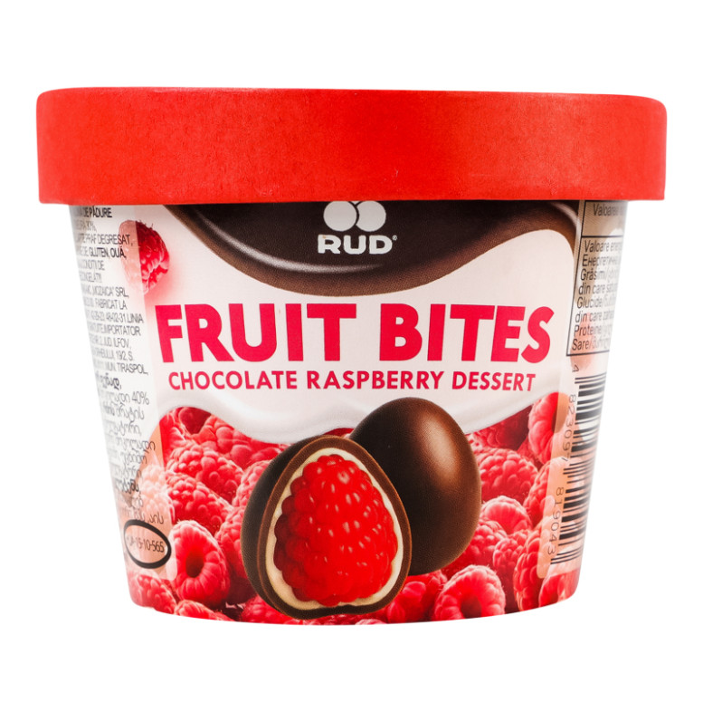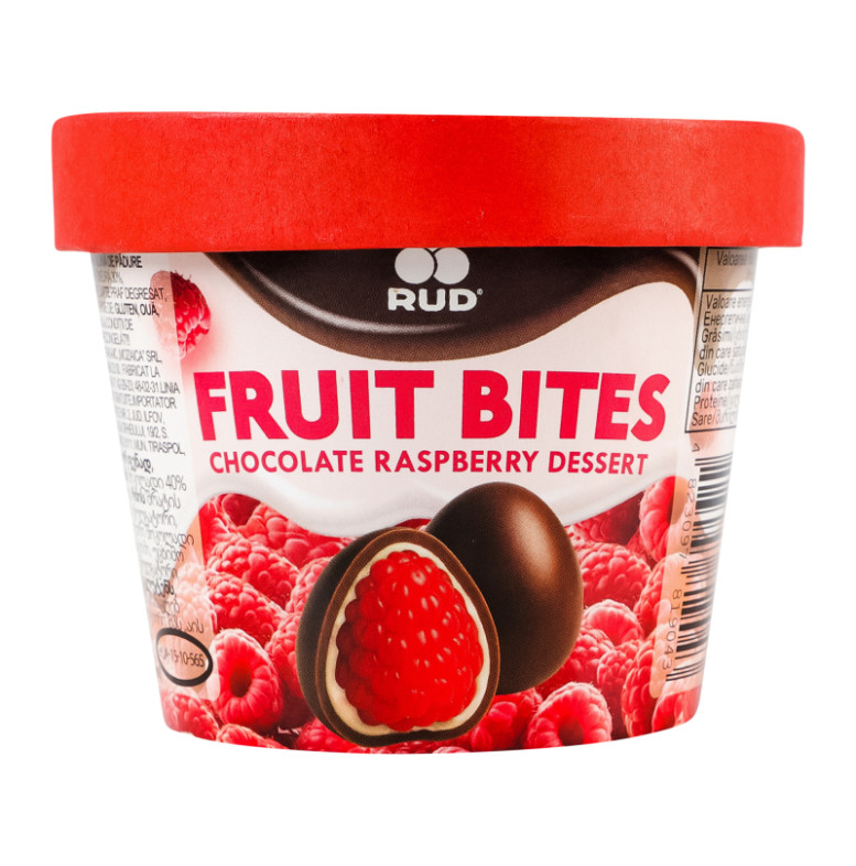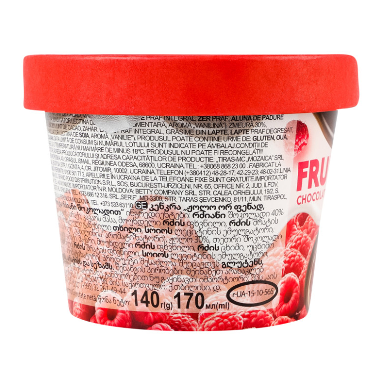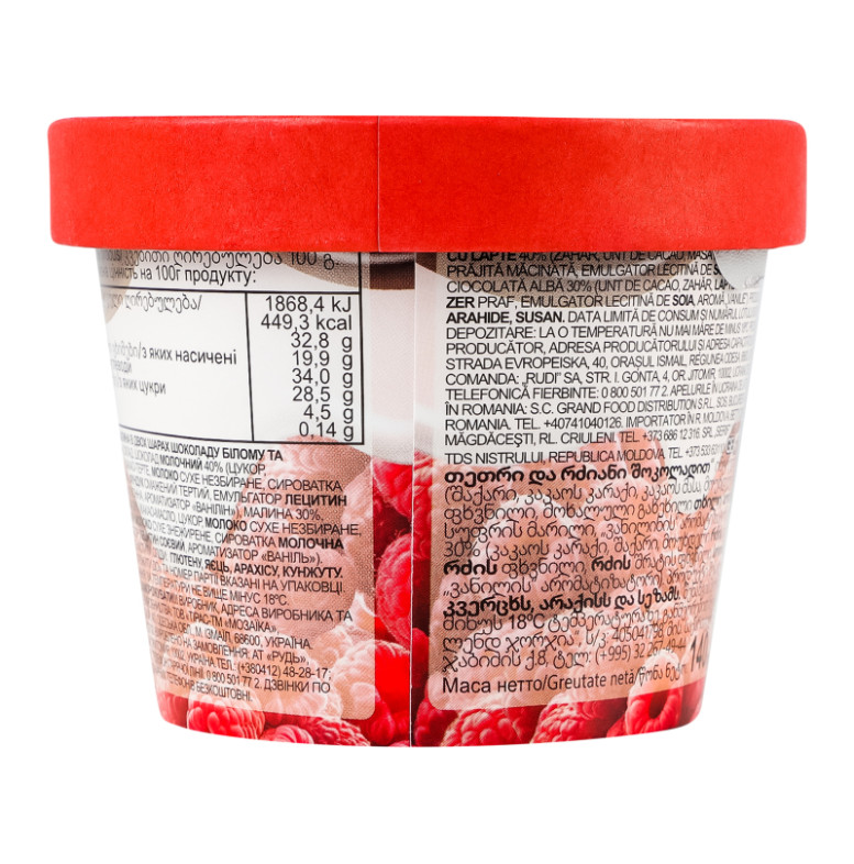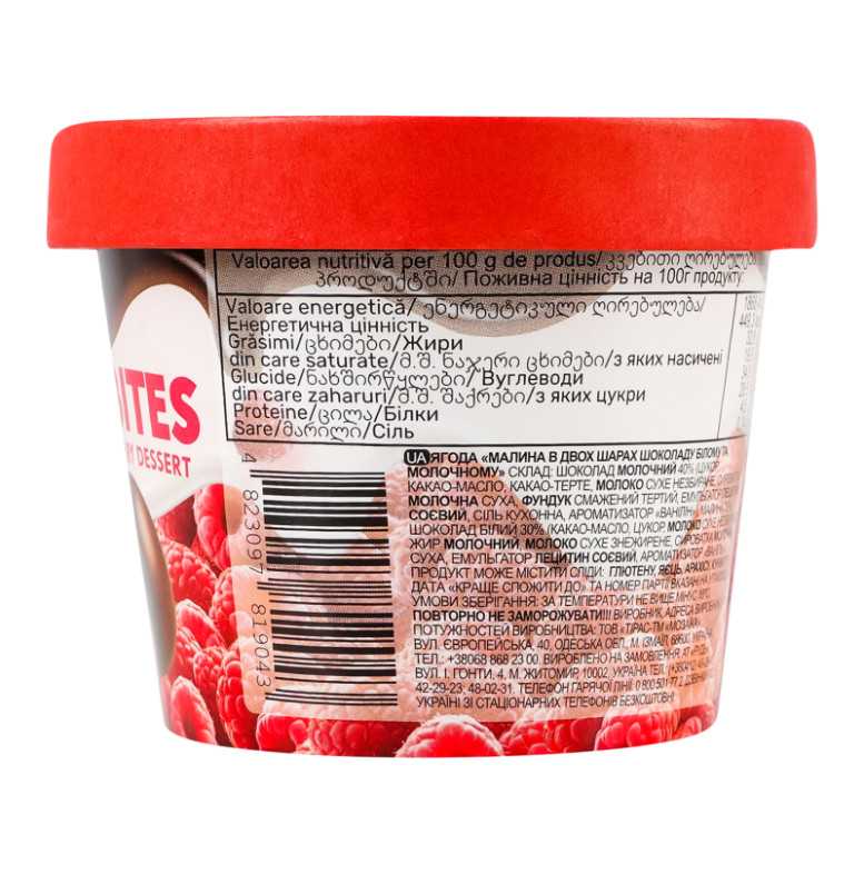 Склад: Шоколад молочний 40% (цукор какао-масло, какао терте, молоко сухе незбиране, сироватка молочна суха, фундук смажений тертий, емульгатор лецитин соєвий, сіль кухонна, ароматизатор "Ванілін"), малина 30%, шоколад білий 30% (какао-масло, цукор, молоко сухе незбиране, жир молочний, молоко сухе знежирене, сироватка молочна суха, емульгатор лецитин соєвий, ароматизатор "Ваніль")