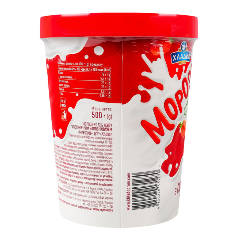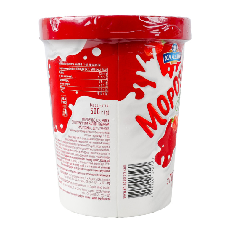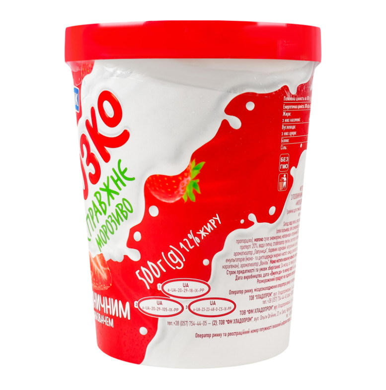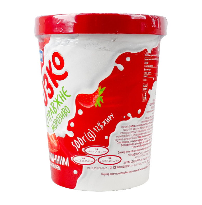 Склад: Вода питна, цукор, замінник молочного жиру (олія пальмова, олія соняшникова, олія кокосова в змінних пропорціях), молоко сухе знежирене, наповнювач полуничний 8% (цукор, плоди полуниці протерті 20%, вода питна, стабілізатор пектин, регулятор кислотності лимонна кислота, ароматизатор "Полуниця", барвник харчовий натуральний кармін), суміш стабілізаторів та емульгаторів (моно- та дигліцериди жирних кислот, камедь ріжкового дерева, гуарова камедь, каррагінан), ароматизатор "Ваніль"
