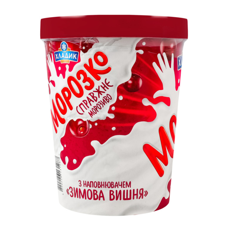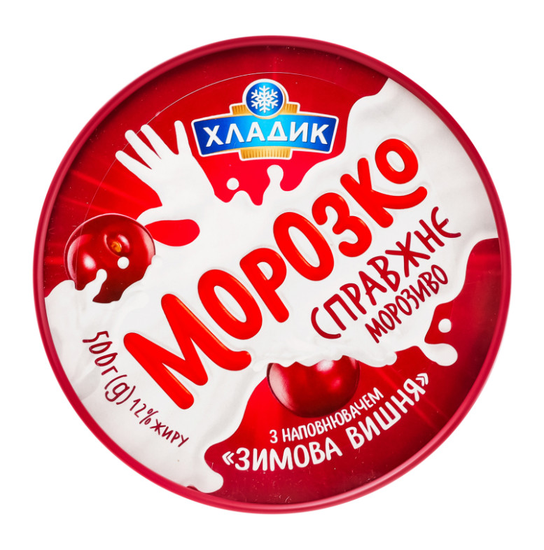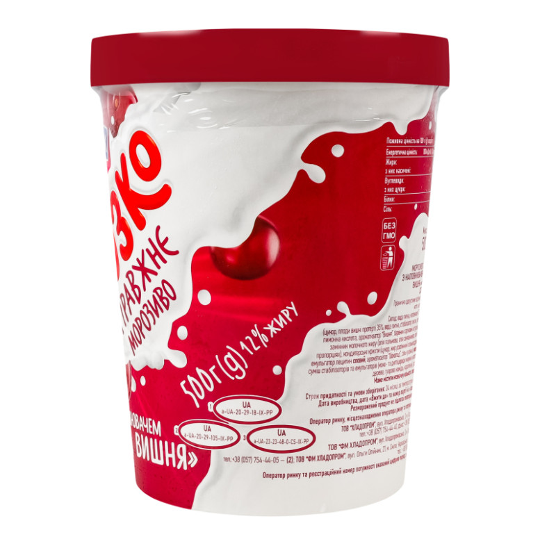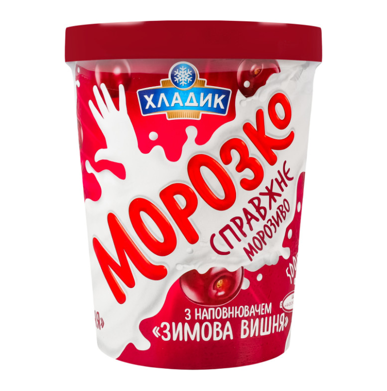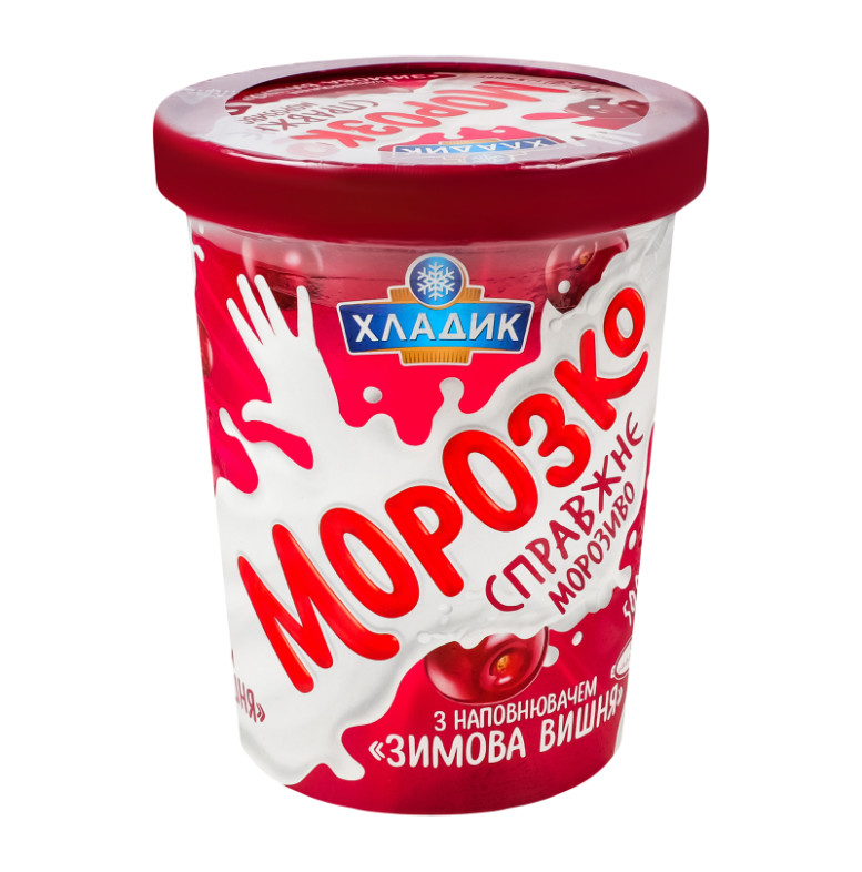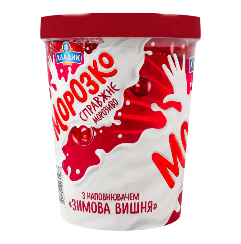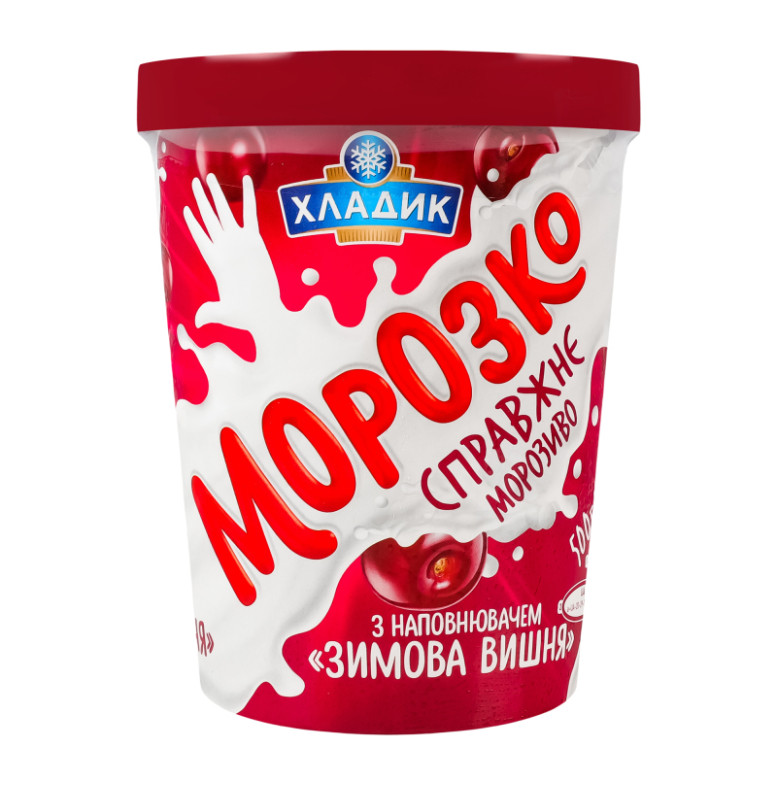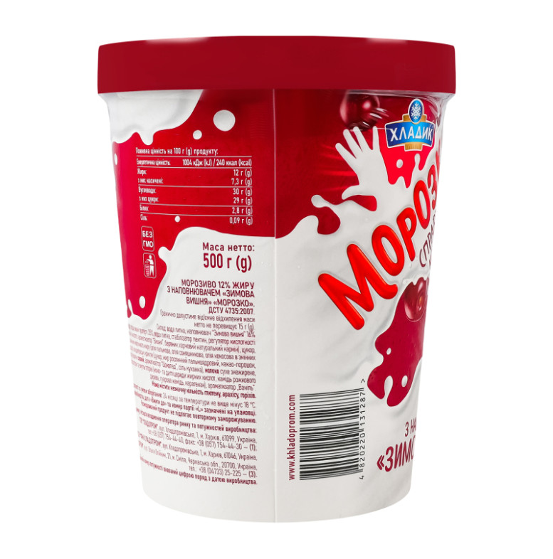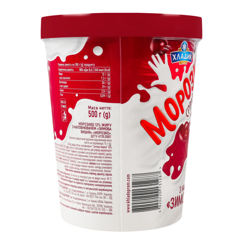 Склад: Вода питна, наповнювач "Зимова вишня" 16% (цукор, плоди вишні протерті 35%, вода питна, стабілізатор пектин, регулятор кислотності лимонна кислота, ароматизатор "Вишня", барвник харчовий натуральний кармін), цукор, замінник молочного жиру (олія пальмова, олія соняшникова, олія кокосова в змінних пропорціях), кондитерські крихти (цукор, жир рослинний пальмоядровий, какао-порошок, емульгатор лецитин соєвий, ароматизатор "Шоколад", сіль кухонна), молоко сухе знежирене, суміш стабілізаторів та емульгаторів (моно- та дигліцериди жирних кислот, камедь ріжкового дерева, гуарова камедь, каррагінан), ароматизатор "Ваніль"