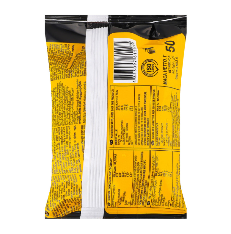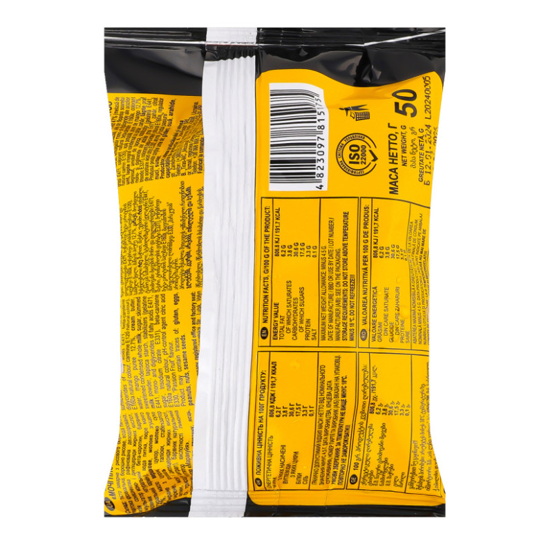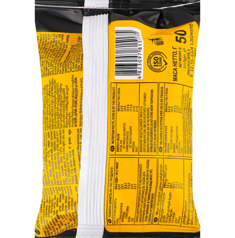 Склад (укр.): Тісто заварне з рисового борошна 47% (патока крохмальна, борошно рисове, вода питна, олія соняшникова рафінована дезодорована, емульгатор моно- і дигліцериди жирних кислот, барвник натуральний бета-каротин, барвник натуральний кармін), вода питна, пюре манго 12.7%, масло вершкове, молоко згущене незбиране з цукром, цукор, молоко сухе знежирене, крохмаль тапіоки, стабілізатор (желатин, моно- і дигліцериди жирних кислот, цукор, трисодіум цитрат), барвник натуральний бета-каротин, регулятор кислотності лимонна кислота, ароматизатор "Маракуйя"