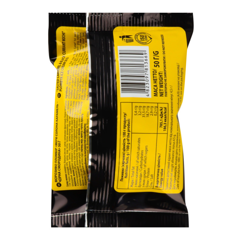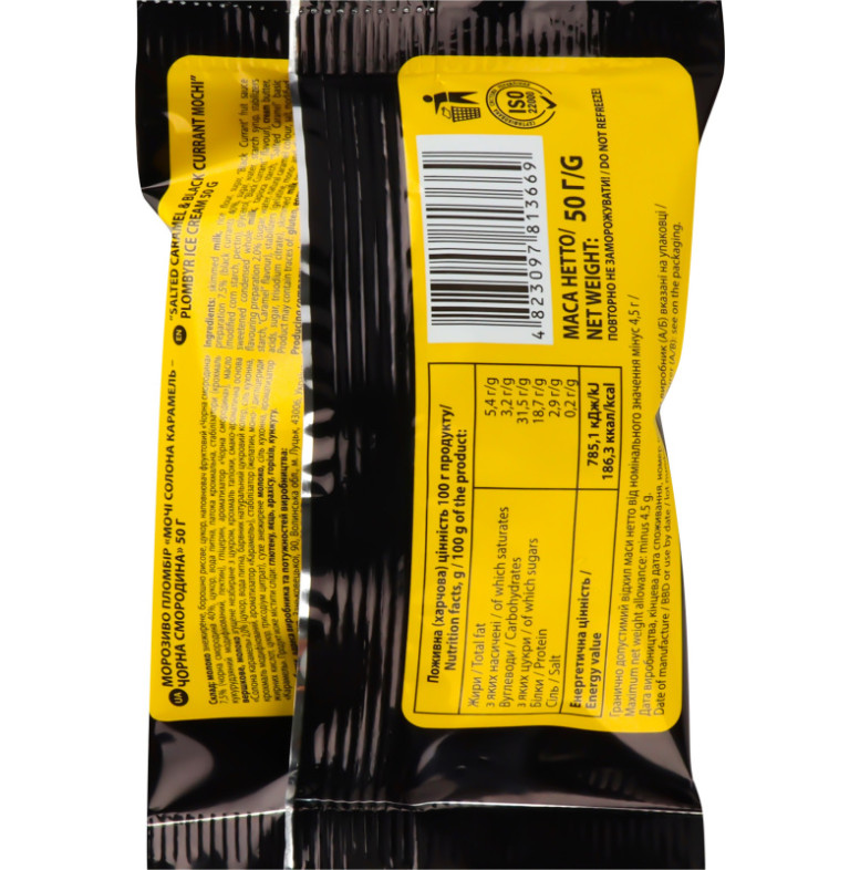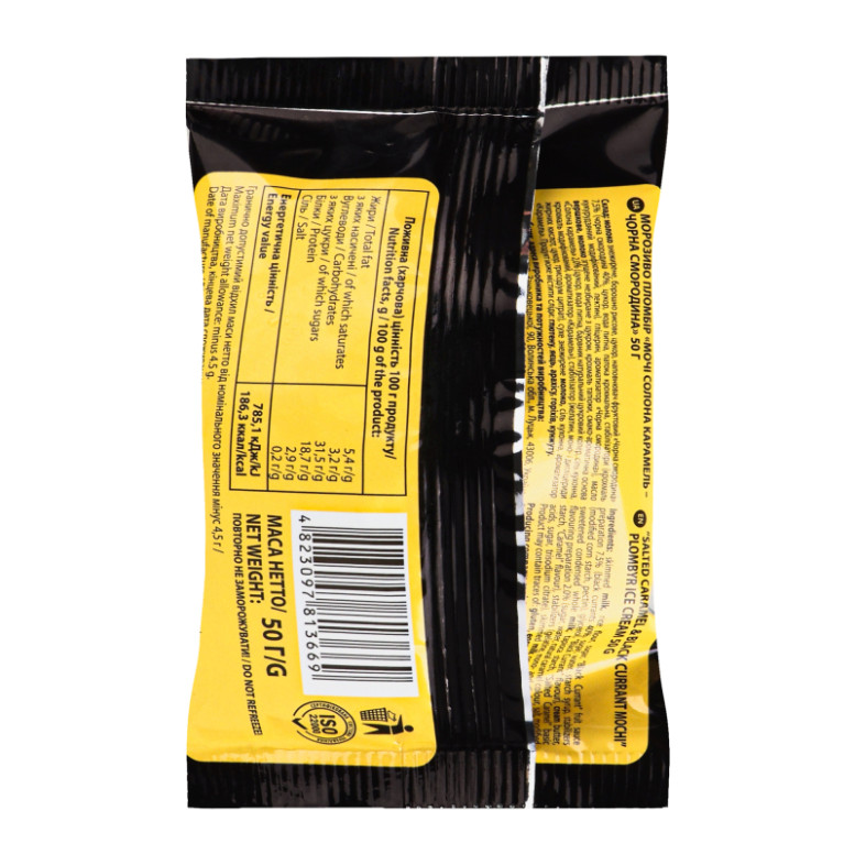 Склад (укр.): Молоко знежирене, борошно рисове, цукор, наповнювач фруктовий "Чорна смородина" 7.5% (чорна смородина 40%, цукор, вода питна, патока крохмальна, стабілізатори (крохмаль кукурудзяний модифікований, пектин), гліцерин, ароматизатор "Чорна смородина"), масло вершкове, молоко згущене незбиране з цукром, крохмаль тапіоки, смако-ароматична основа "Солона карамель" 2% (цукор, вода питна, барвник натуральний цукровий колер, сіль кухонна, крохмаль модифікований, ароматизатор "Карамель"), стабілізатор (желатин, моно- і дигліцериди жирних кислот, цукор, трисодіум цитрат), сухе знежирене молоко, сіль кухонна, ароматизатор "Карамель"