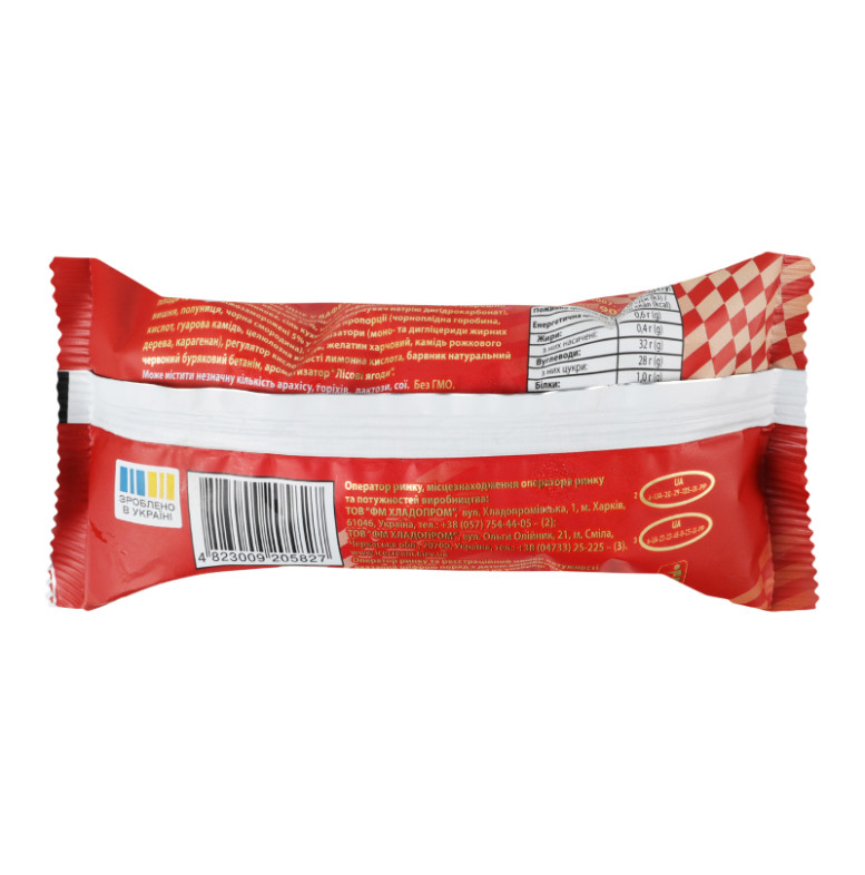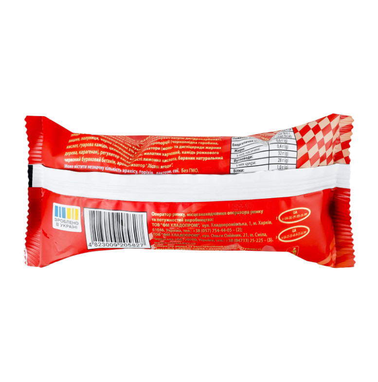| Склад (укр.) | Вода питна, пюре яблучне 25%, цукор, вафельний стаканчик 6% (борошно пшеничне, олія соняшникова, сіль кухонна, розпушувач натрію дигідрокарбонат), плоди та ягоди свіжозаморожені 5% у змінній пропорції (чорноплідна горобина, вишня, полуниця, чорна смородина), стабілізатори (моно- та дигліцериди жирних кислот, гуарова камедь, целюлозна камедь, желатин харчовий, камедь ріжкового дерева, каррагінан), регулятор кислотності лимонна кислота, барвник натуральний червоний буряковий бетанін, ароматизатор "Лісові ягоди" |