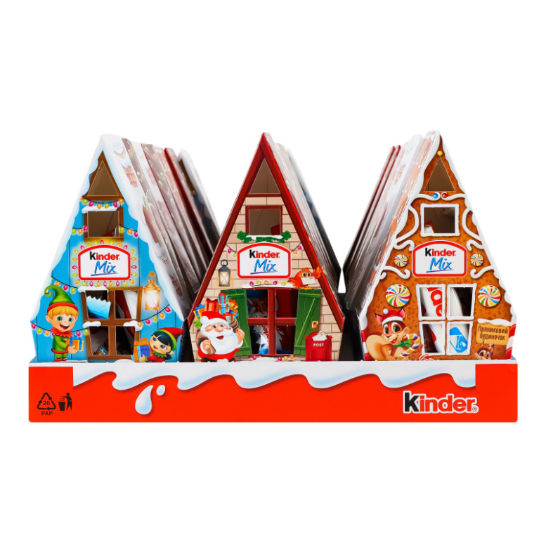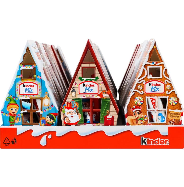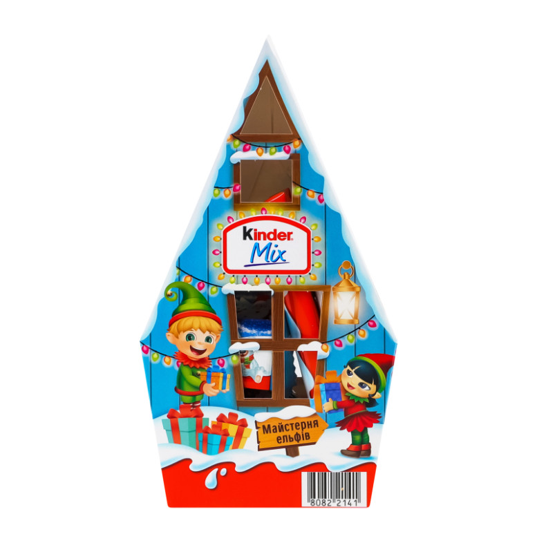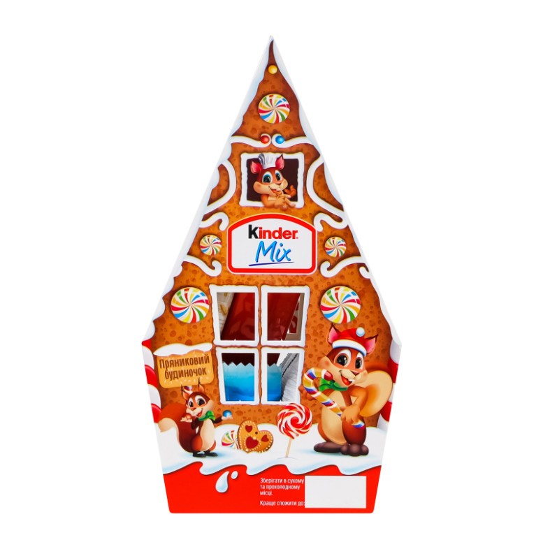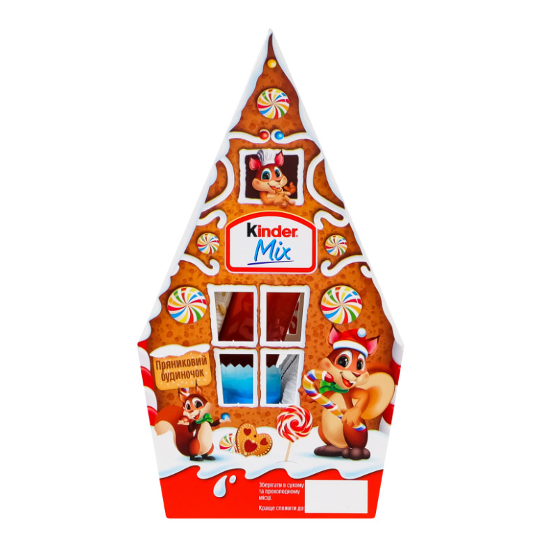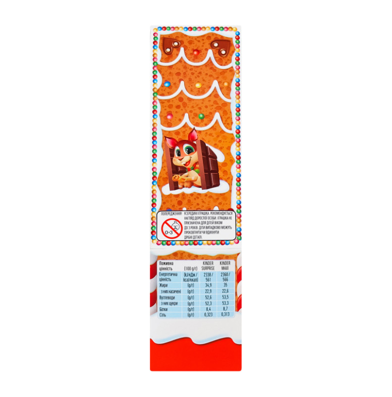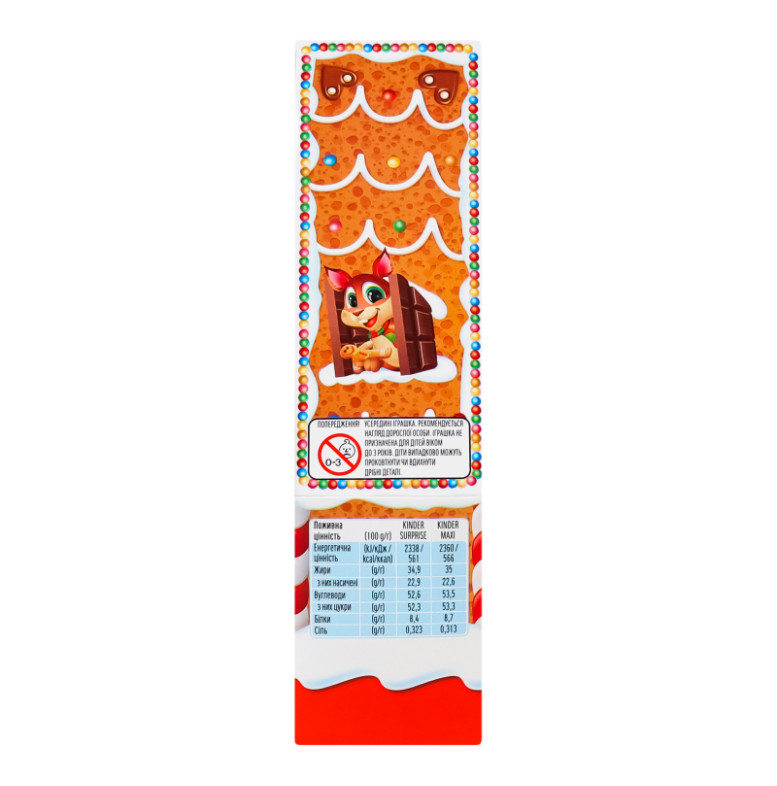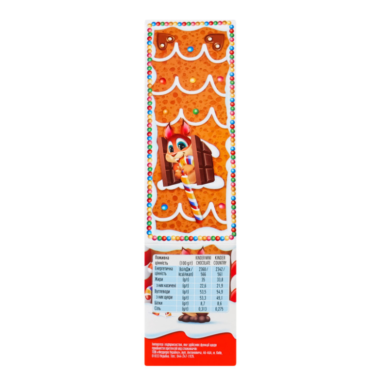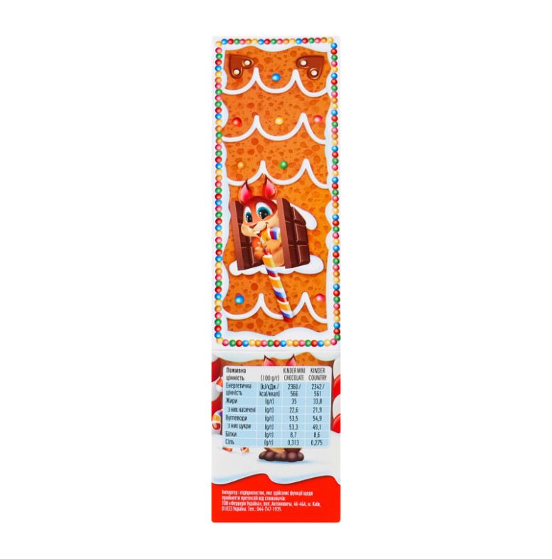 Склад (укр.)Kinder Country: молочний шоколад 33.5% (цукор, какао-масло, молоко сухе незбиране, какао терте, емульгатор: лецитин (соєвий), ванiлiн, мiнiмальний вміст какао-продуктів 34.5%), цукор, молоко сухе знежирене 18%, жир рослинний (пальмовий), повітряні зерна злаків 7.5% (ячмінь, рис, пшениця, пшениця спельта, гречка), молочний жир, емульгатор: лецитин (соєвий), ванілін. Kinder Surprise: молочний шоколад 47% (цукор, молоко сухе незбиране, какао-масло, какао терте, емульгатор: лецитин (соєвий), ванiлiн, мiнiмальний вміст какао-продуктів 32%), молоко сухе знежирене (17%), цукор, жири рослинні (пальма, ши), молочний жир, емульгатор: лецитин (соєвий), ванілін. Kinder Mini Chocolate: молочний шоколад 40% (цукор, молоко сухе незбиране, какао-масло, какао терте, емульгатор: лецитин (соєвий), ванілін, мінімальний вміст какао-продуктів 32%), цукор, молоко сухе знежирене (18%), жир рослинний (пальма), молочний жир, емульгатор: лецитин (соєвий), ванілін. Kinder Maxi: молочний шоколад 40% (цукор, молоко сухе незбиране, какао-масло, какао терте, емульгатор: лецитин (соєвий), ванілін, мiнiмальний вміст какао-продуктів 32%), цукор, молоко сухе знежирене (18%), жир рослинний (пальмовий), молочний жир, емульгатор: лецитин (соєвий), ванілін