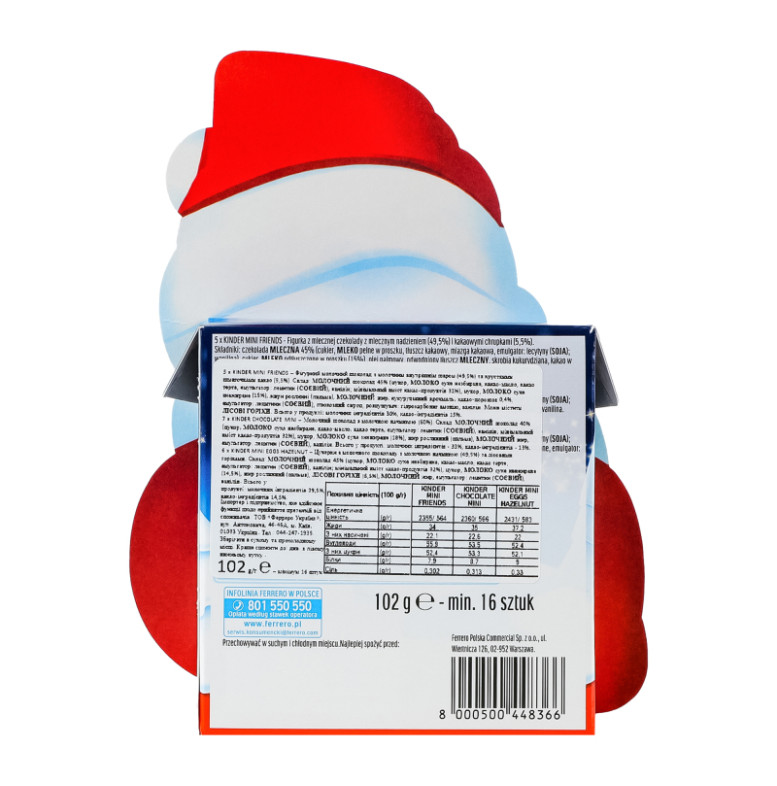 Склад: Mini Friends фігурний молочний шоколад з молочним внутрішнім шаром (49.5%) та хрусткими шматочками какао (5.5%): молочний шоколад 45% (цукор, молоко сухе незбиране, какао-масло, какао терте, емульгатор: лецитин (соєвий), ванілін, мінімальний вміст какао-продуктів 32%), цукор, молоко сухе знежирене (15%), жири рослинні (пальма), молочний жир, кукурудзяний крохмаль, какао-порошок 0.4%, емульгатор: лецитини (соєвий), глюкозний сироп, розпушувач: гідрокарбонат амонію, ванілін. Chocolate Mini молочний шоколад з молочною начинкою (60%): молочний шоколад 40% (цукор, молоко сухе незбиране, какао-масло, какао терте, емульгатор: лецитин (соєвий), ванілін, мінімальний вміст какао-продуктів 32%), цукор, молоко сухе знежирене (18%), жир рослинний (пальма), молочний жир, емульгатор: лецитин (соєвий), ванілін. Mini Eggs Hazelnut цукерки з молочного шоколаду з молочною начинкою (49.5%) та лісовими горіхами: молочний шоколад 45% (цукор, молоко сухе незбиране, какао-масло, какао терте, емульгатор: лецитин (соєвий), ванілін, мінімальний вміст какао-продуктів 32%), цукор, молоко сухе знежирене (14.5%), жир рослинний (пальма), лісові горіхи (6.5%), молочний жир, емульгатор: лецитин (соєвий), ванілін