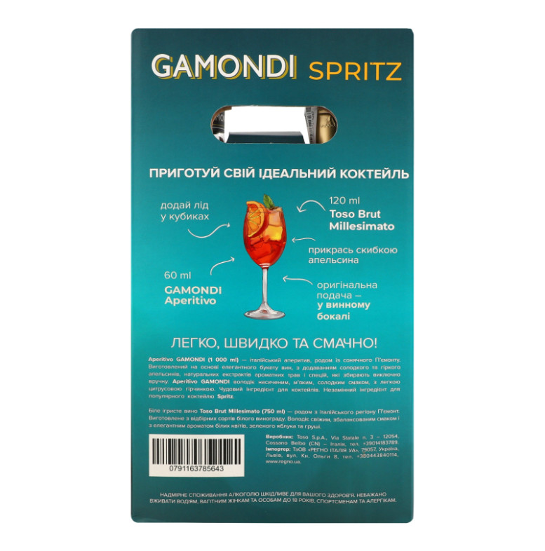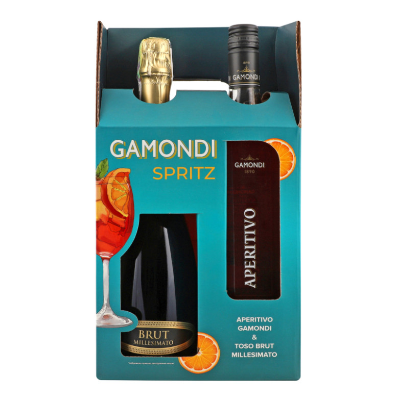 Набір Напій на основі вина 1л 13.5% Aperitivo + Вино ігристе 0.75л 12% біле Brut Millesimato Toso Spritz Gamondi к/у 1шт