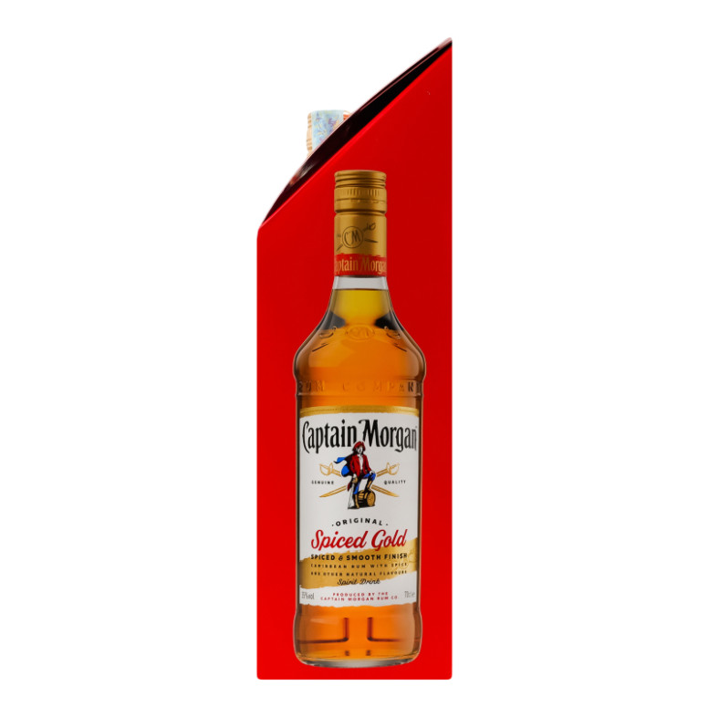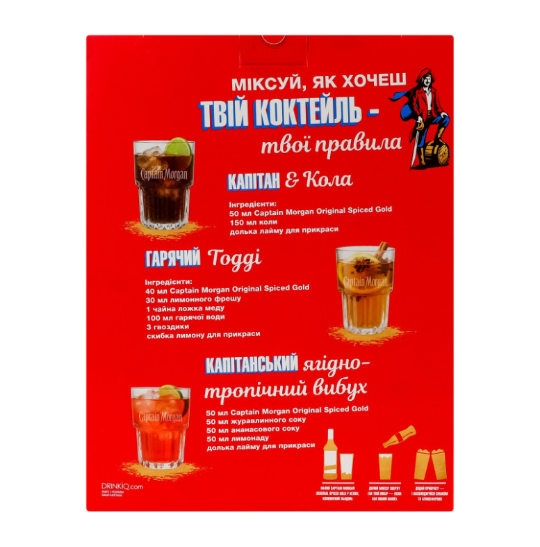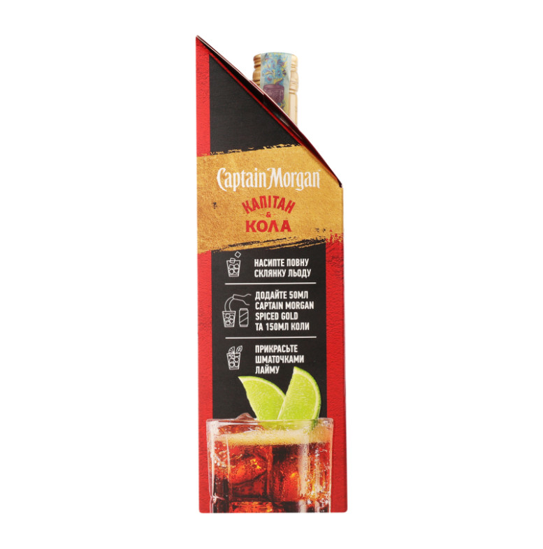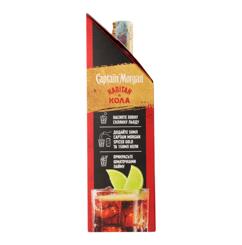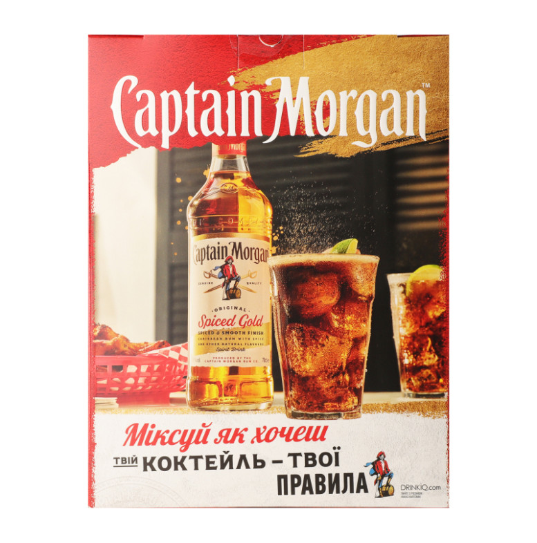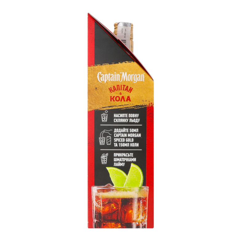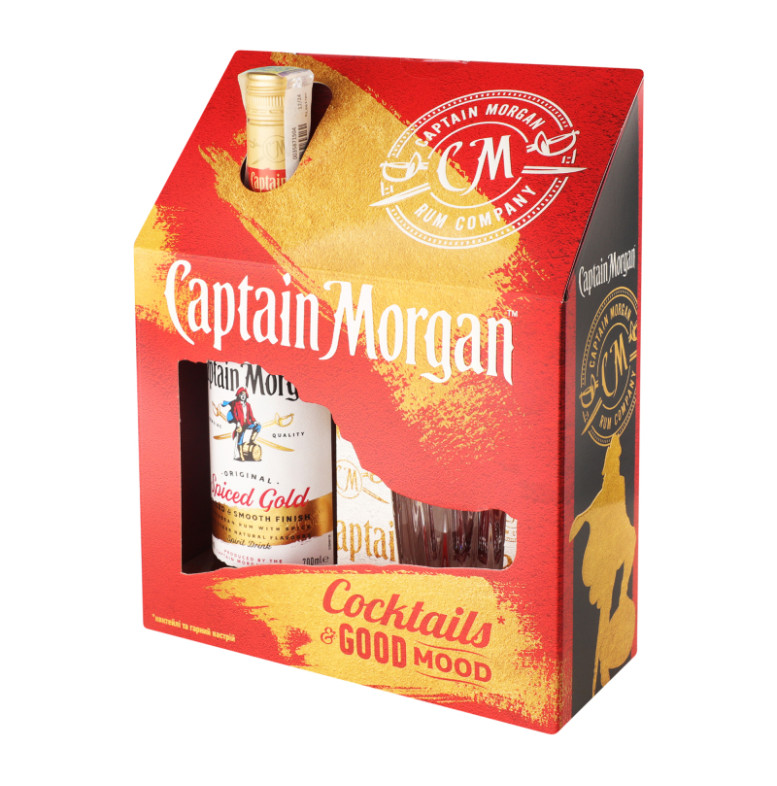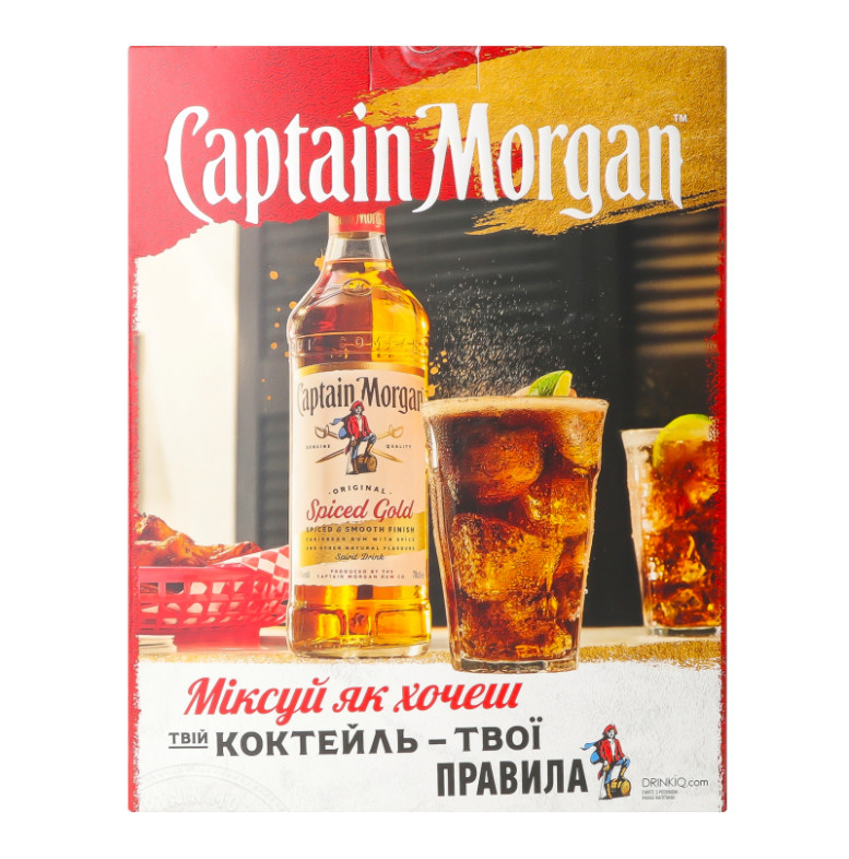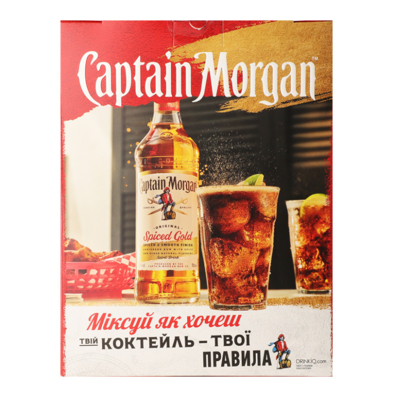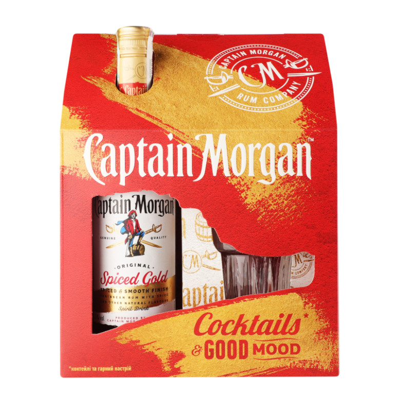 | Склад (укр.) | Алкогольний напій на основі карибського рому Captain Morgan Spiced Gold: карибський ром (спирт етиловий ректифікований із цукрової тростини (вік витримки в середньому близько 2 років), вода підготовлена, цукор, натуральний ароматизатор ванілі, барвник - цукровий колер І (простий) (Е150а), склянка з логотипом СМ: скло |