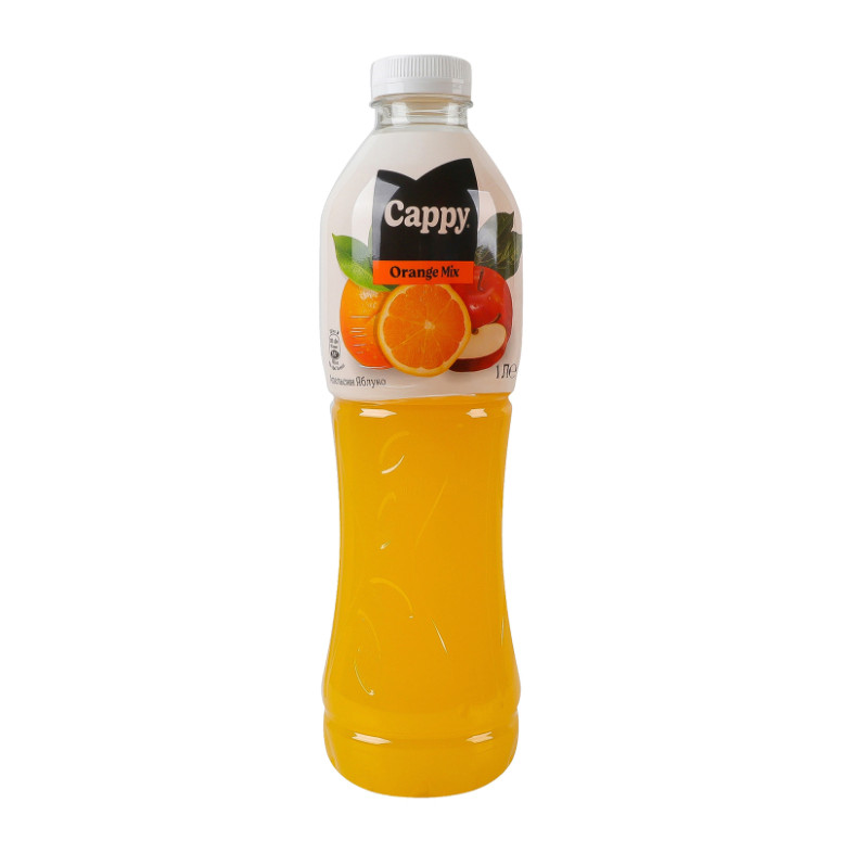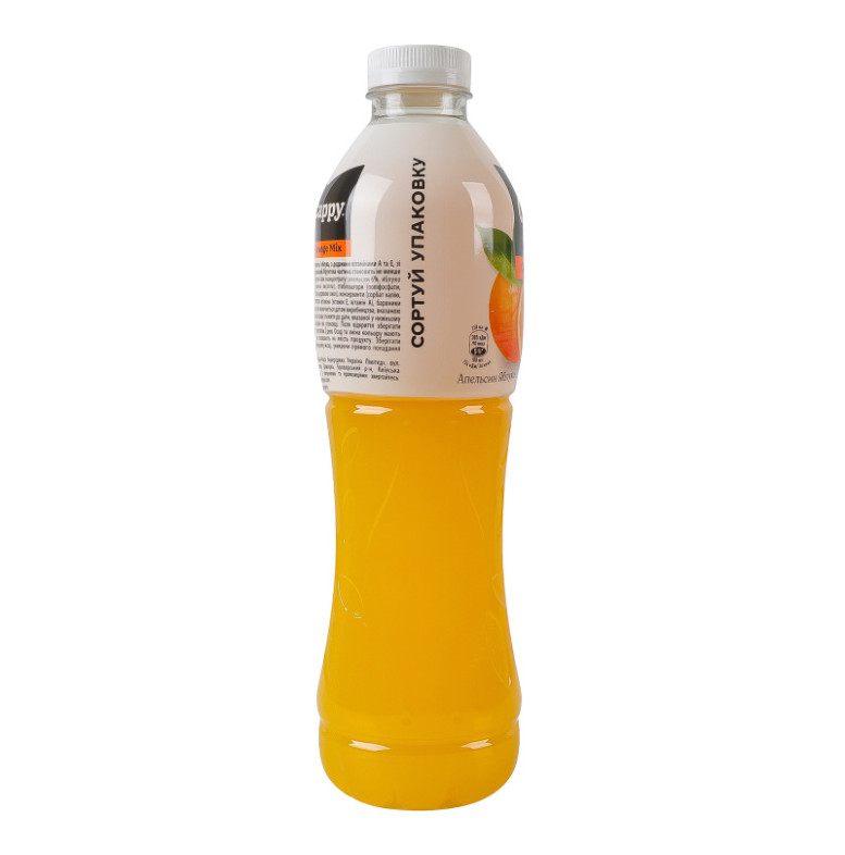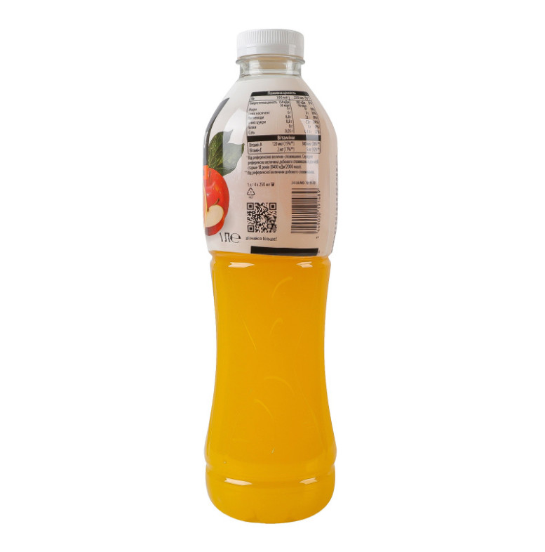 Склад: Вода питна, фруктові соки з концентрату (апельсин 6%, яблуко 4%), цукор, кислота (лимонна кислота), стабілізатори (поліфосфати, гуміарабік та гліцеринові ефіри деревних смол), консерванти (сорбат калію, бензоат натрію), ароматизатори, вітаміни (вітамін Е, вітамін А), барвники (каротини, Е150d)