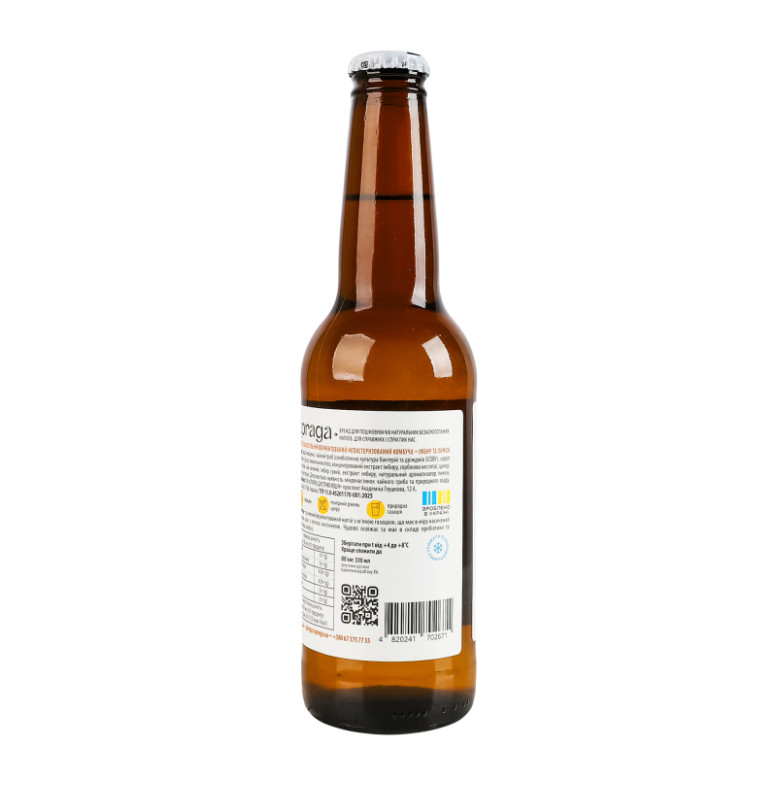 Склад: Вода очищена, чайний гриб (симбіотична культура бактерій та дріжджів SCOBY), сироп імбирний (цукор, лимонна кислота, концентрований екстракт імбиру, сорбінова кислота), цукор, чай чорний, чай зелений, імбир сухий, екстракт імбиру, натуральний ароматизатор лимон, діоксид вуглецю