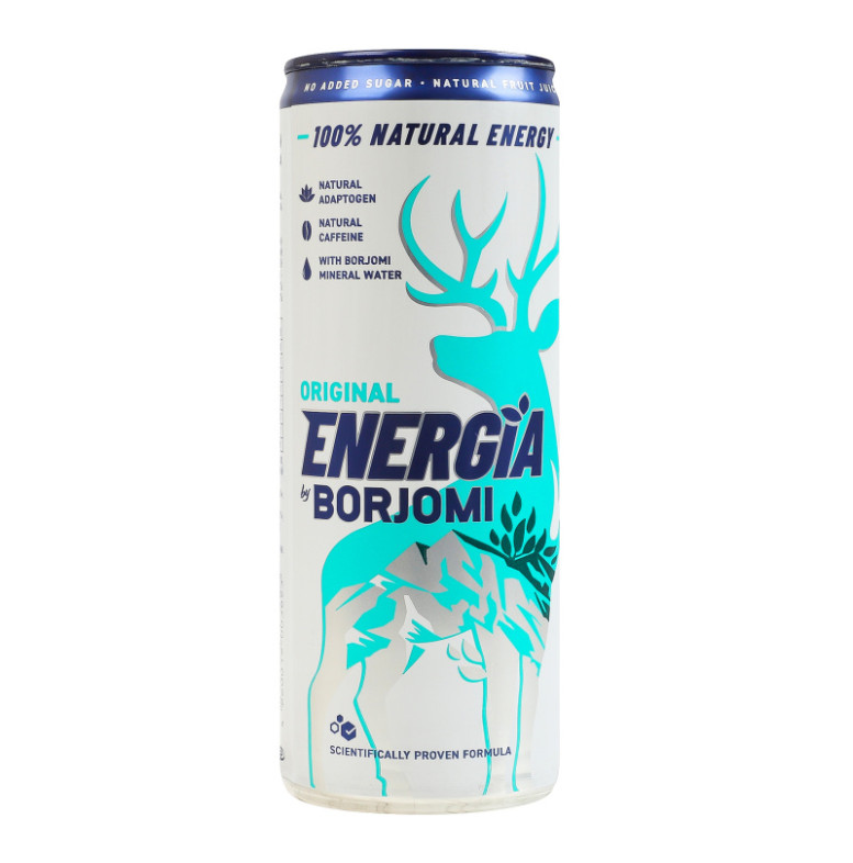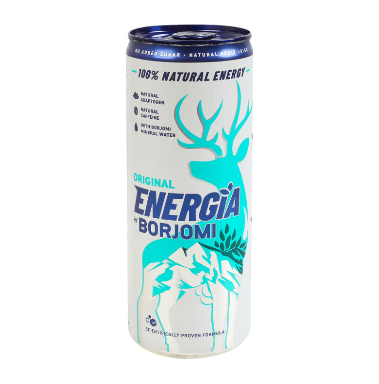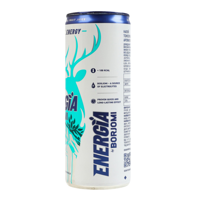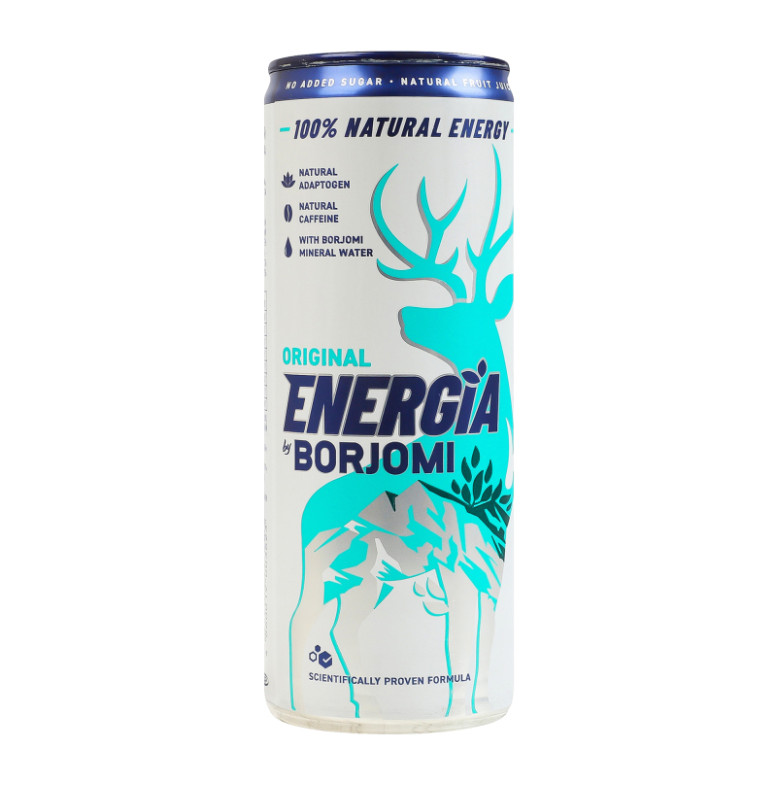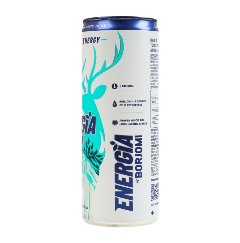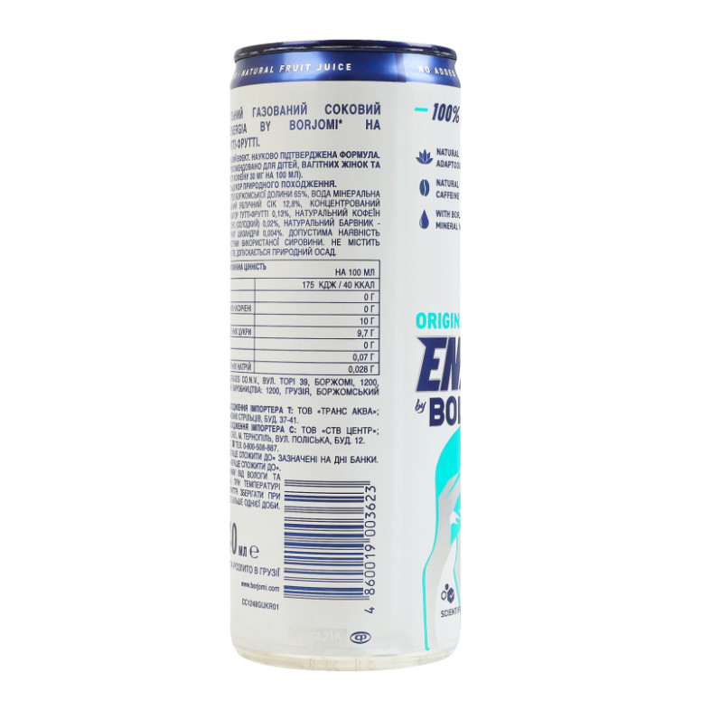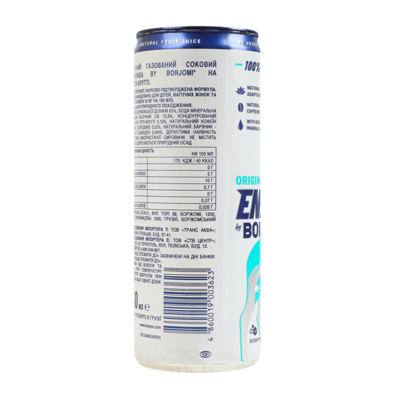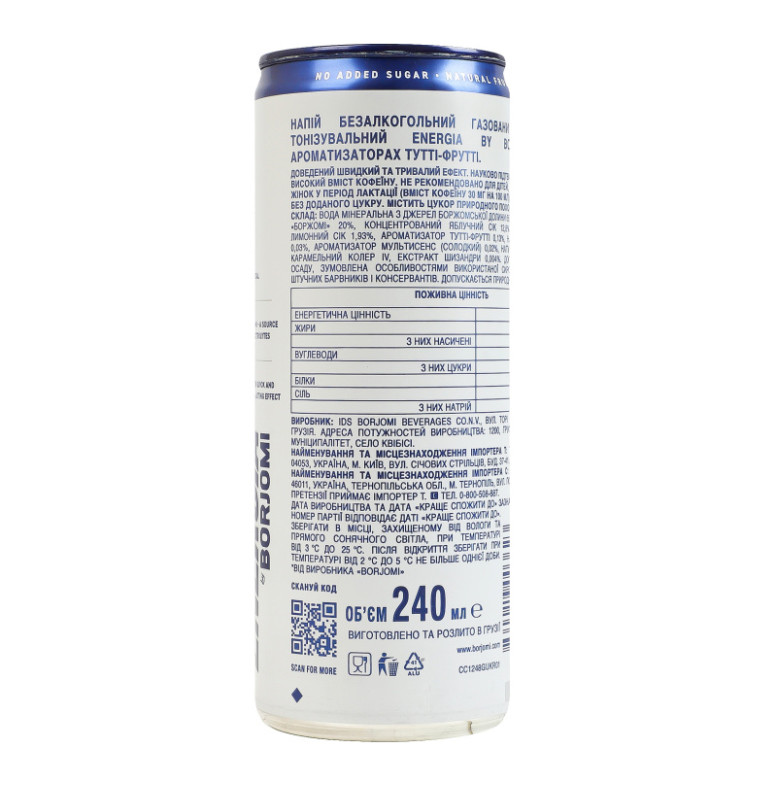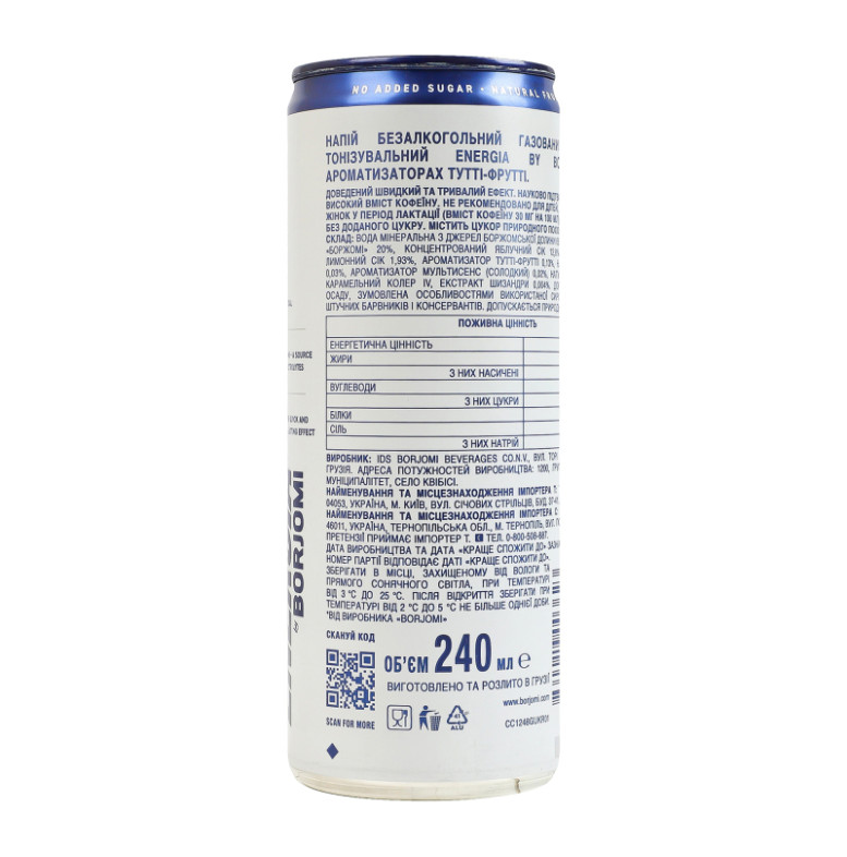 Склад: Вода мінеральна з джерел боржомської долини 65%, вода мінеральна "Боржомі" 20%, концентрований яблучний сік 12.8%, концентрований лимонний сік 1.93%, ароматизатор тутті-фрутті 0.13%, натуральний кофеїн 0.03%, ароматизатор мультисенс (солодкий) 0.02%, натуральний барвник - карамельний колер IV, екстракт шизандри 0.004%