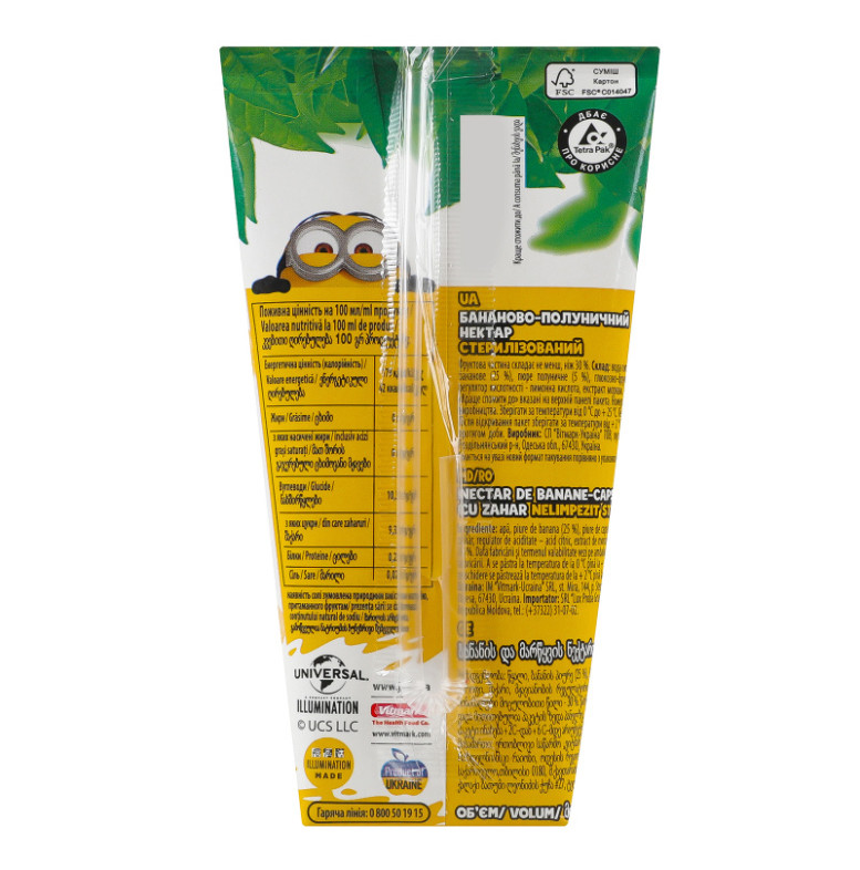 | Склад (укр.) | Вода питна артезіанська, пюре бананове (25%), пюре полуничне (5%), глюкозно-фруктозний сироп, цукор, регулятор кислотності - лимонна кислота, екстракт моркви |