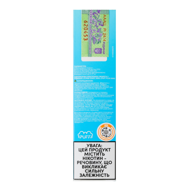 Застереження/міри безпеки (ua) | Увага: цей виріб містить нікотин - речовину, що викликає сильну залежність. Тримати якнайдалі від вогню. Зберігати у недоступному для дітей місці. Продукт заборонено вживати особам до 18 років, алергікам, вагітним та годуючим жінкам. Цей продукт містить нікотин, що викликає звикання. Не занурювати у воду, не розбирати, використовувати згідно з інструкцією. Експлуатація виробу вважається завершеною, коли припиняється подача пари. Не є харчовим продуктом |