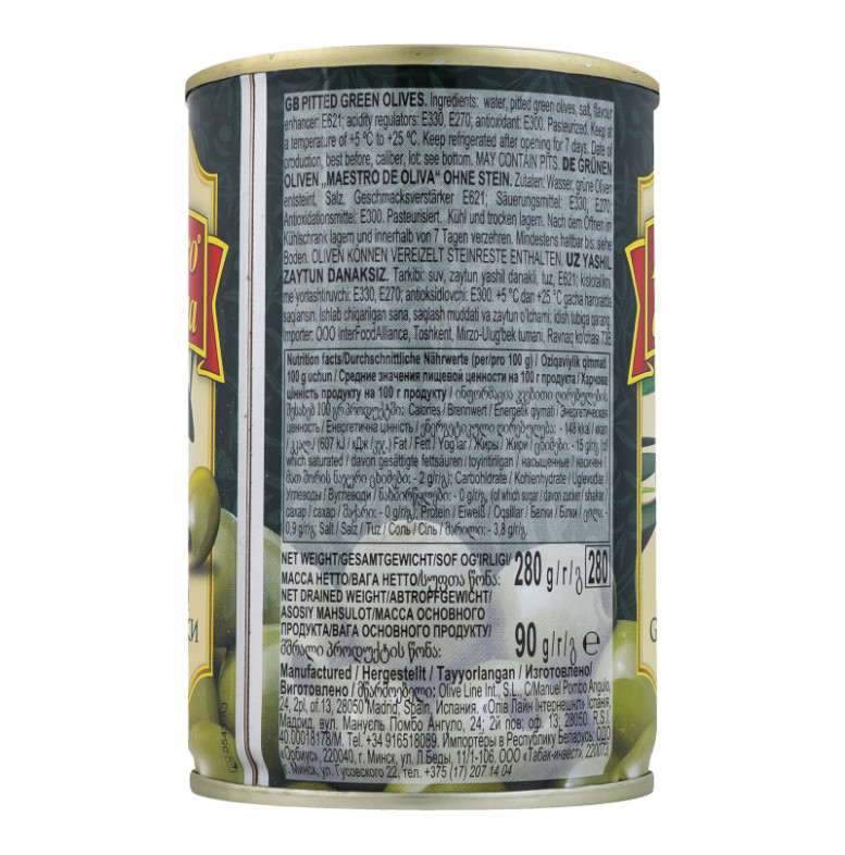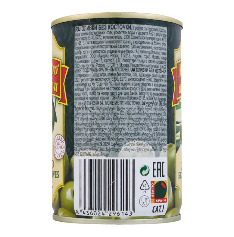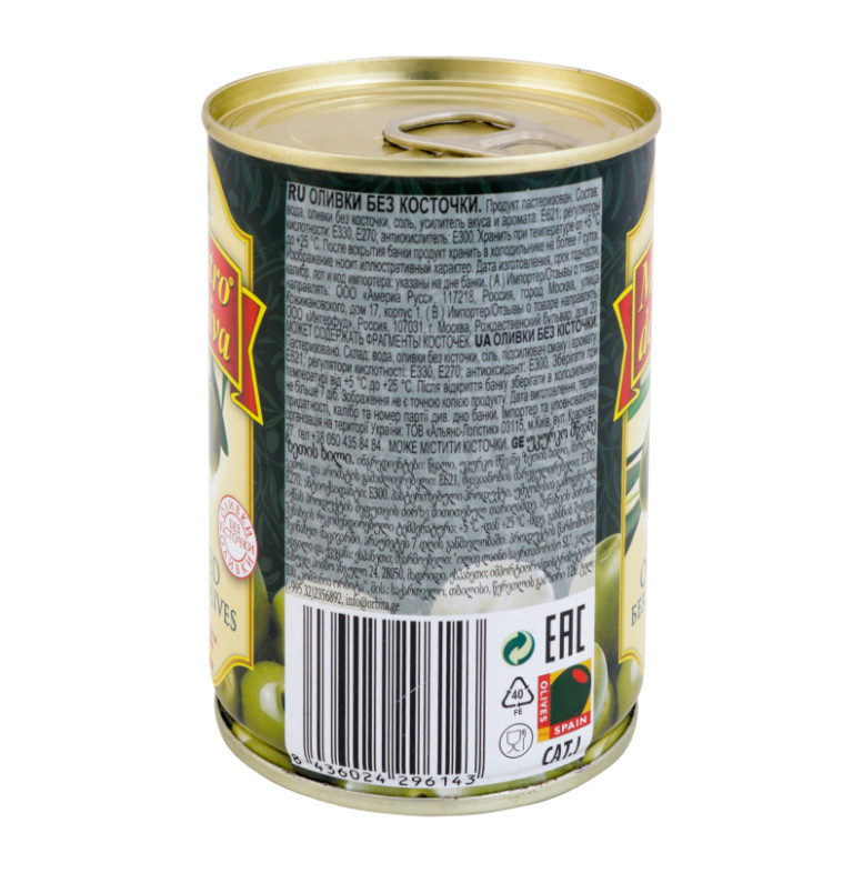 | Склад (укр.) | Вода, оливки без кісточки, сіль, підсилювач смаку і аромату: Е621, регулятори кислотності: Е330, Е270, антиоксидант: Е300 |