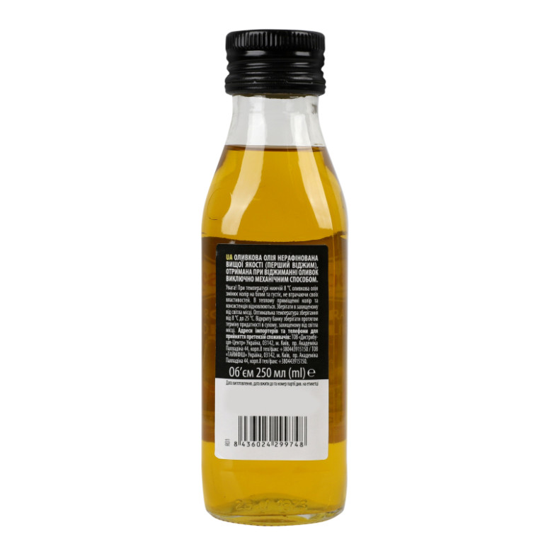 Склад: Оливкова олія нерафінована вищої якості (перший віджим), отримана при віджиманні оливок виключно механічним способом
