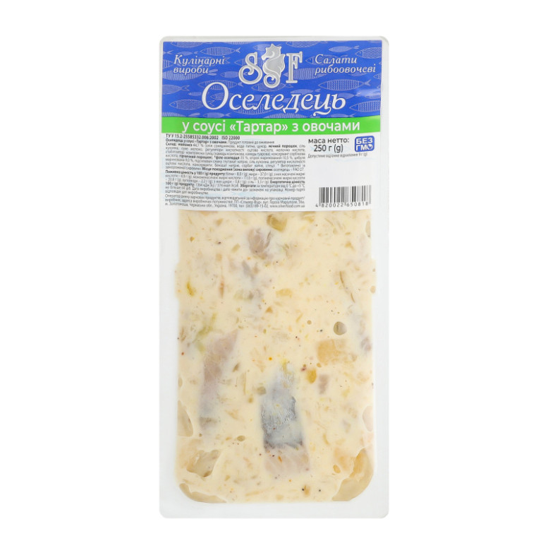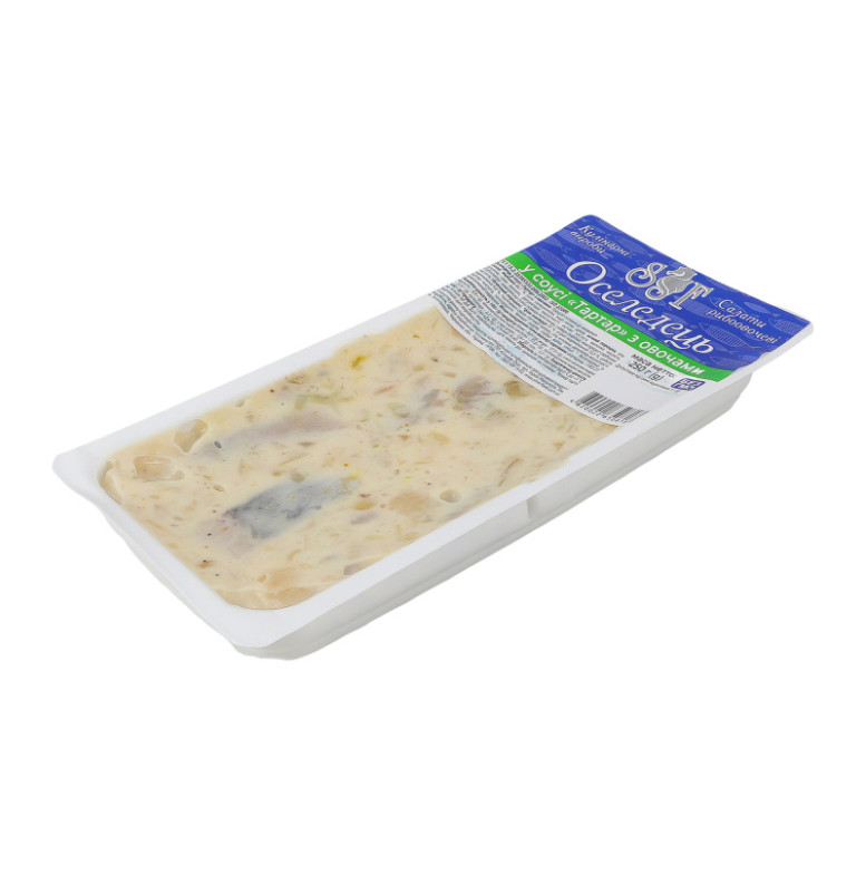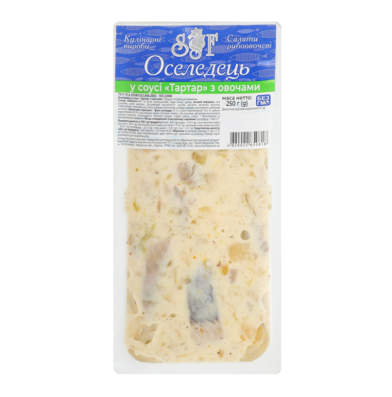 Склад: Майонез 44.7% (олія соняшникова, вода питна, цукор, яєчний порошок, сіль кухонна, сухе молоко, регулятори кислотності: оцтова кислота, молочна кислота, стабілізатор - комплексна суміш (камедь ксантанова, камедь гуарова), консервант сорбінова кислота, гірчичний порошок), філе оселедця 35%, огірок маринований 10.5%, цибуля маринована 9%, підсилювач смаку глутамат натрію, сіль кухонна, регулятор кислотності оцтова кислота, консерванти: бензоат натрію, сорбат калію, спеції