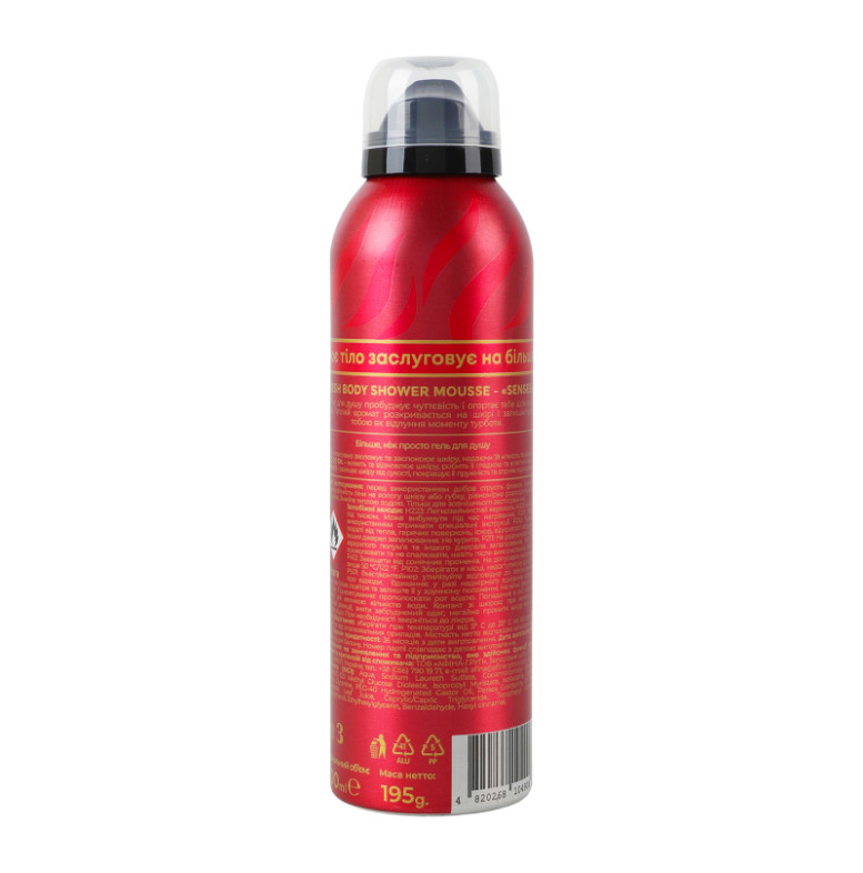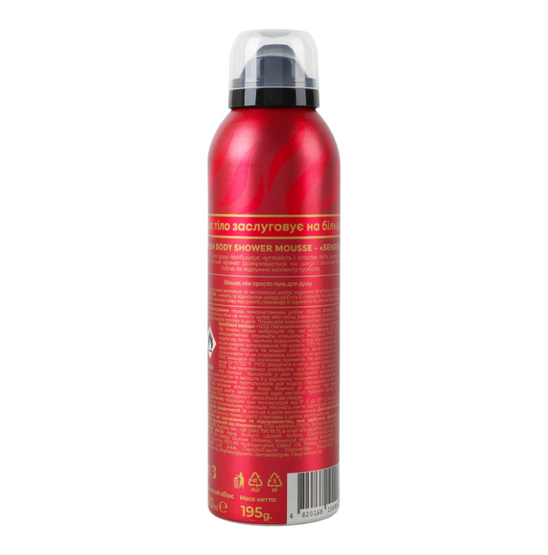 | Склад (укр.) | Вода, лауретсульфат натрію, кокамідопропіл бетаїн, бутан, ПЕГ-120 метилглюкози діолеат, ізопропілміристат, ізобутан, парфумерна композиція, пропан, гліцерин, гідрогенізована касторова олія ПЕГ-40, олія авокадо, сік листя алое вера, каприловий/каприновий тригліцерид, токоферилацетат, феноксіетанол, етилгексилгліцерин, бензальдегід, гексил циннамаль |