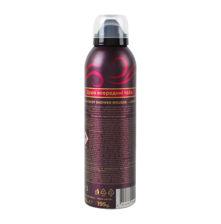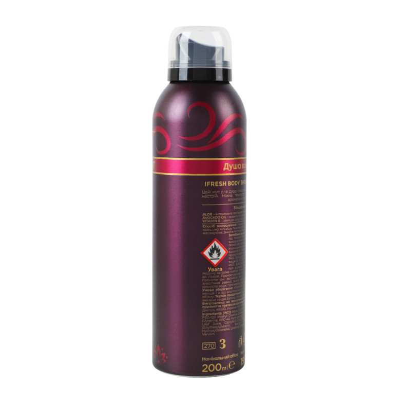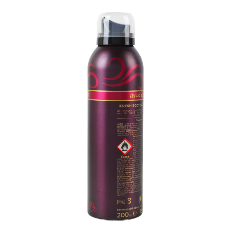 | Склад (укр.) | Вода, лауретсульфат натрію, кокамідопропіл бетаїн, бутан, ПЕГ-120 метилглюкози діолеат, ізопропілміристат, ізобутан, парфумерна композиція, пропан, гліцерин, гідрогенізована касторова олія ПЕГ-40, олія авокадо, сік листя алое вера, каприловий/каприновий тригліцерид, токоферилацетат, феноксіетанол, етилгексилгліцерин, бензилсаліцилат, кумарин, гексаметилінданопіран, гідроксицитронеллаль, ліналоол, ліналілацетат, тетраметил ацетил октагідро нафталін |